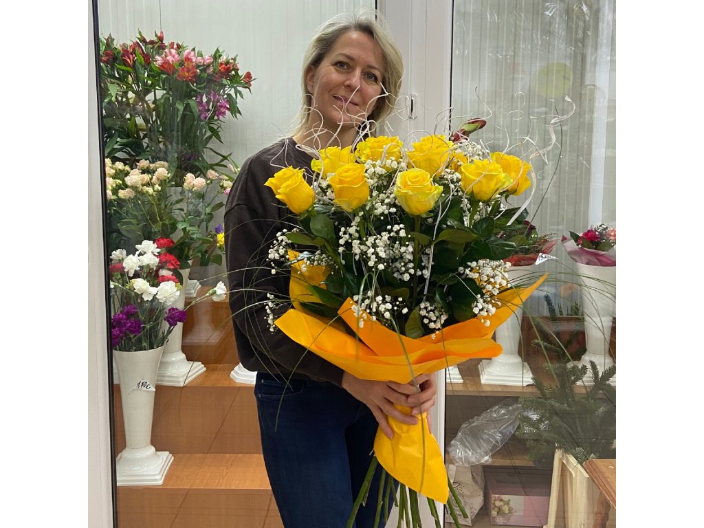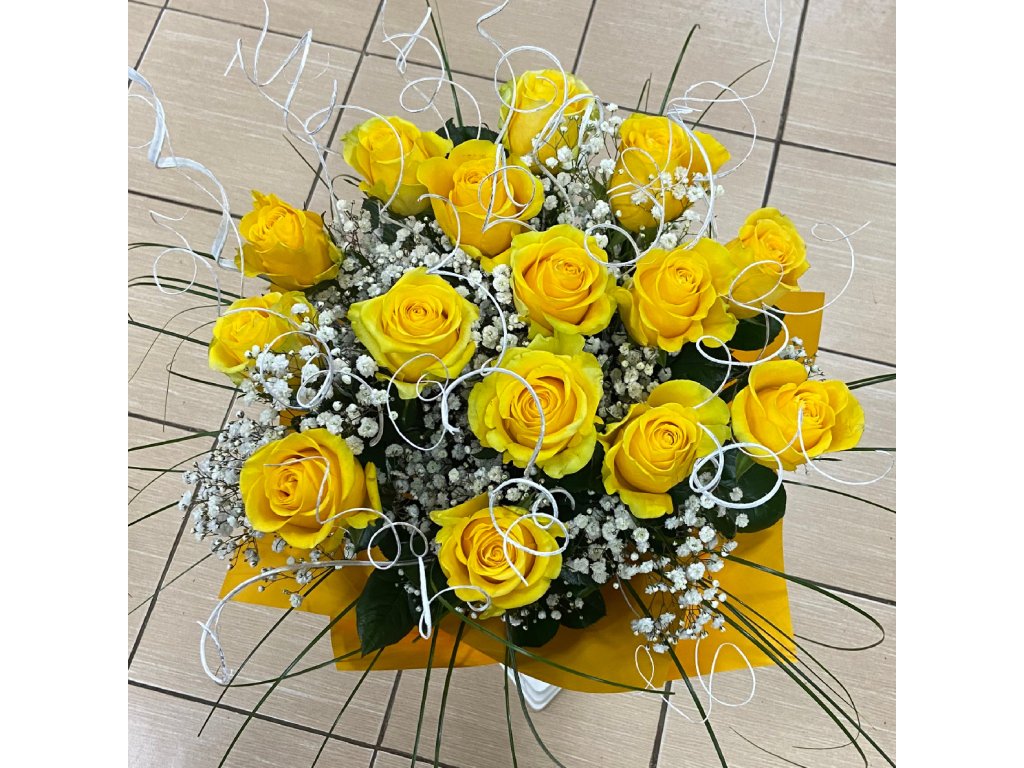 Kytica je zložená z 15 žltých ruží, gypsophily, beargrassu, bielymi špirálkami a ukončená vode odolným farebným papierom.