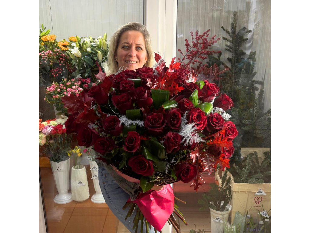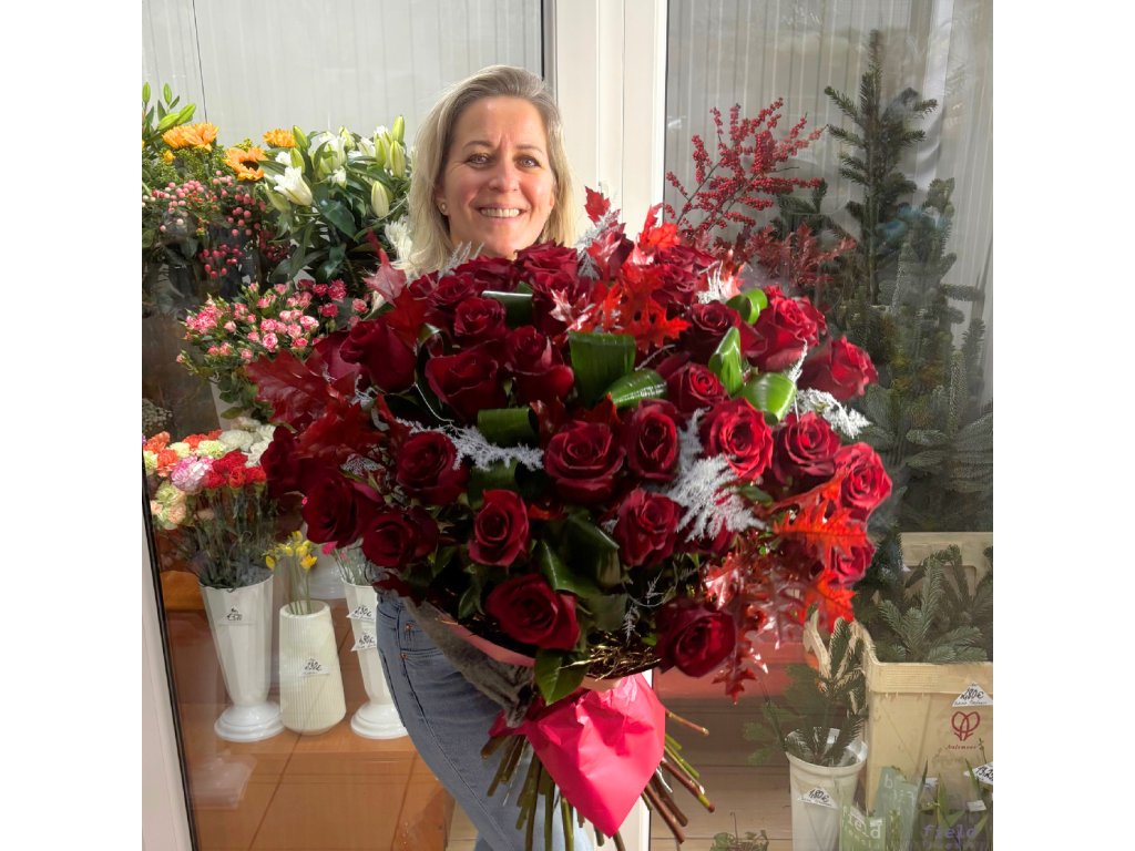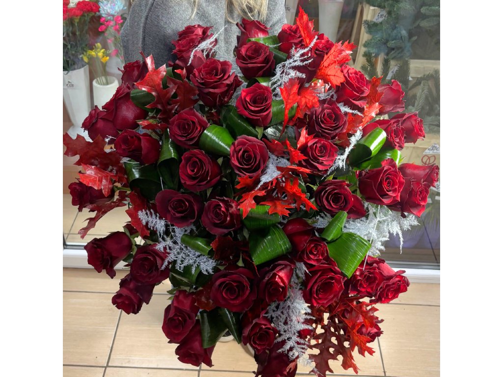 Kytica je zložená zo 40 červených ruží, aspidistry, bielej plumózy, červeného qverkusu a ukončená vodeodolným farebným papierom.