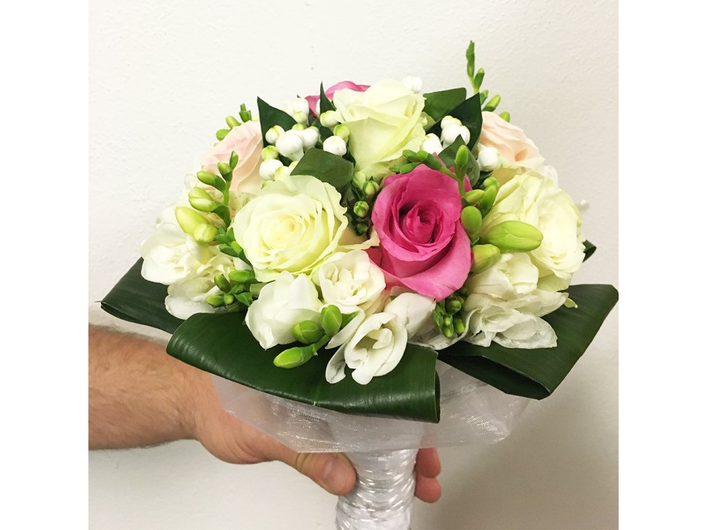 Kytica je zložená z 5 bielych, 2 cyklamenových a 2 ružových ruží, bielych frézií, bielej bouvardie, aspidistry a doplnkov.