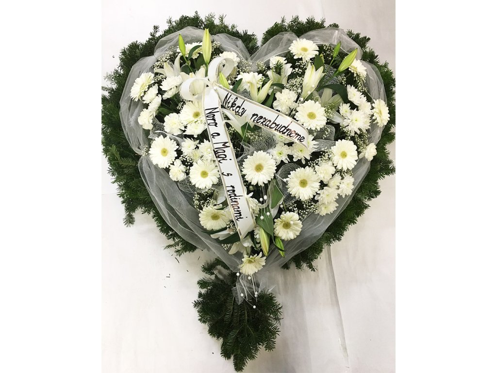 Veniec sa skladá zo živého čačinového základu v tvare srdca, bielych gerbier, bielych chryzantém, bielych karafiátov, bielych ľálií, gypsophily, vypisovanej stuhy, organzy a doplnkov.