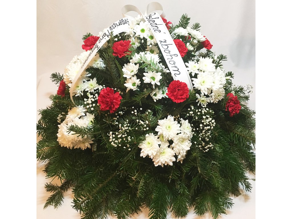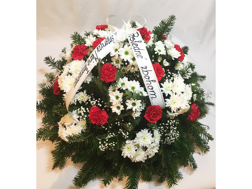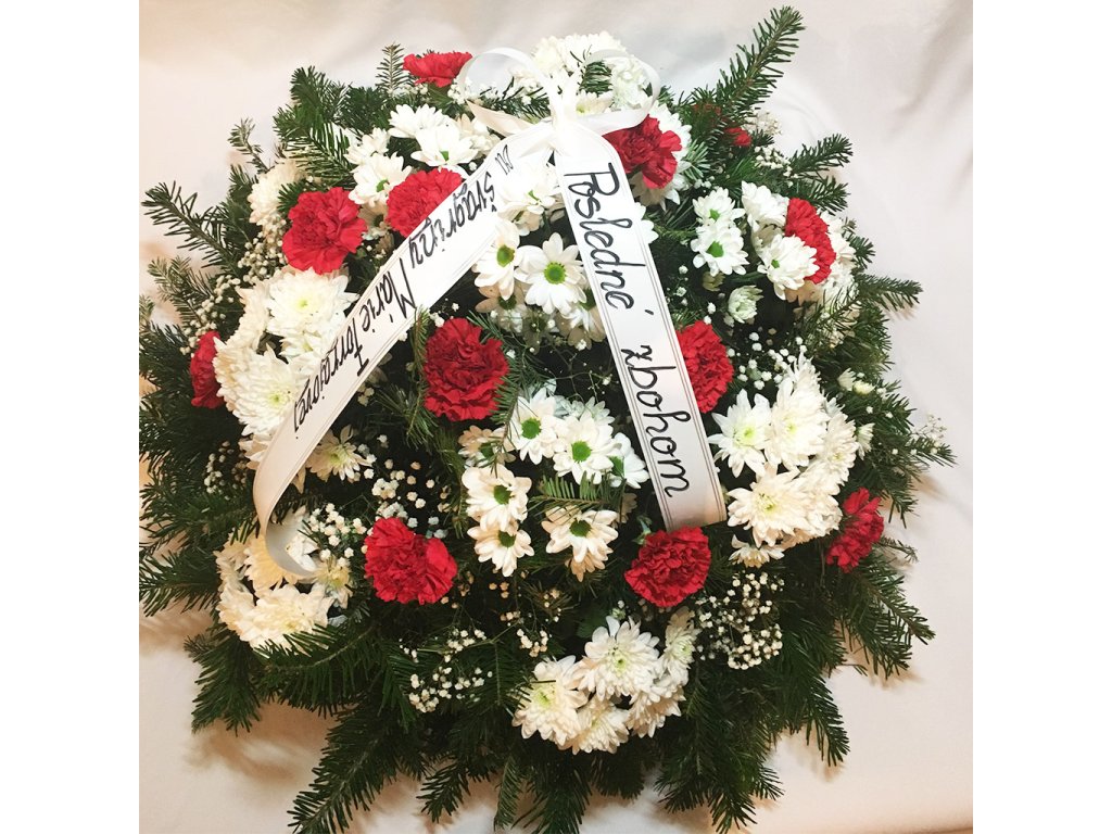Veniec je zložený zo živého čačinového základu s priemerom 80 cm, 16 červených karafiatov, 14 bielych chryzantém, gypsophily a vypisovanej