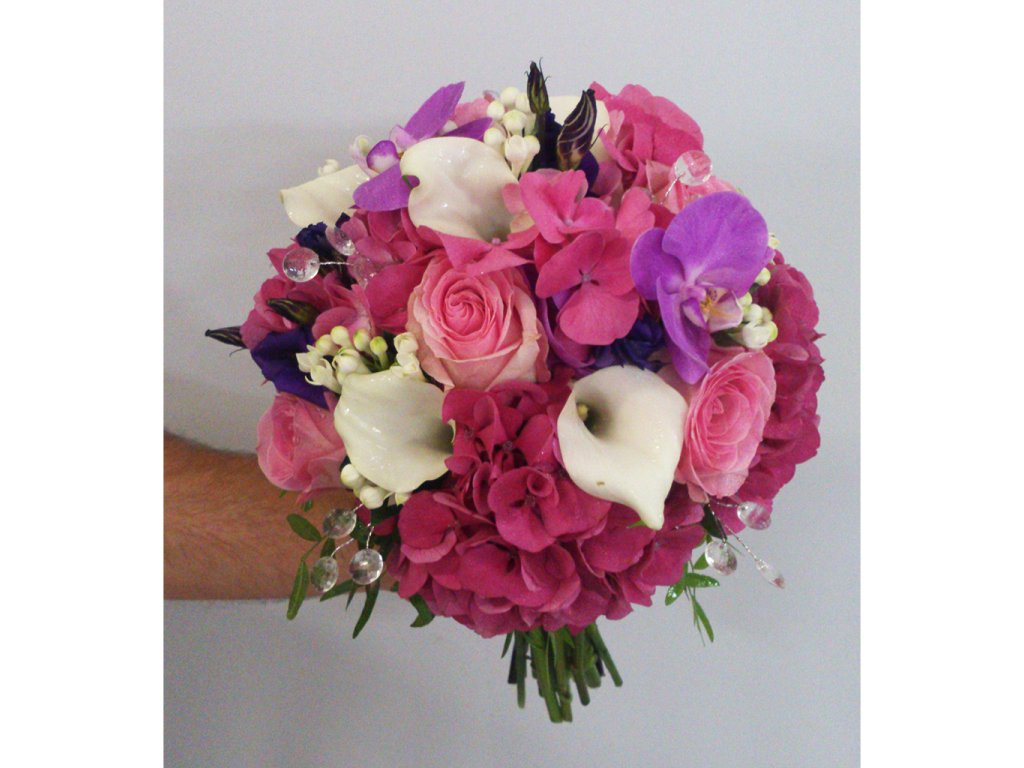 Kytica je zložená z cyklamenovej hortenzie, bielych kál, ružových ruží, fialovej eustomy, bielej bouvardie, fialkovej orchidei,