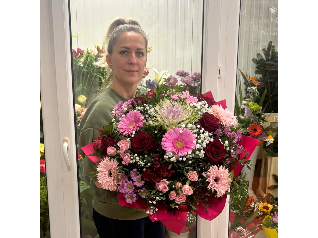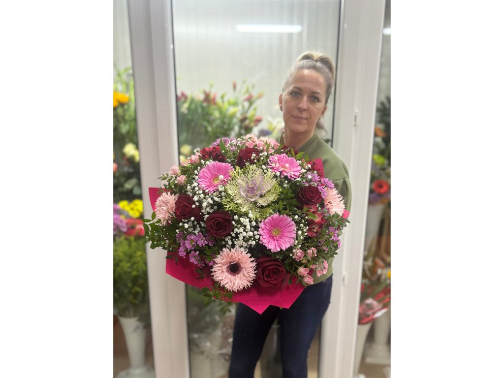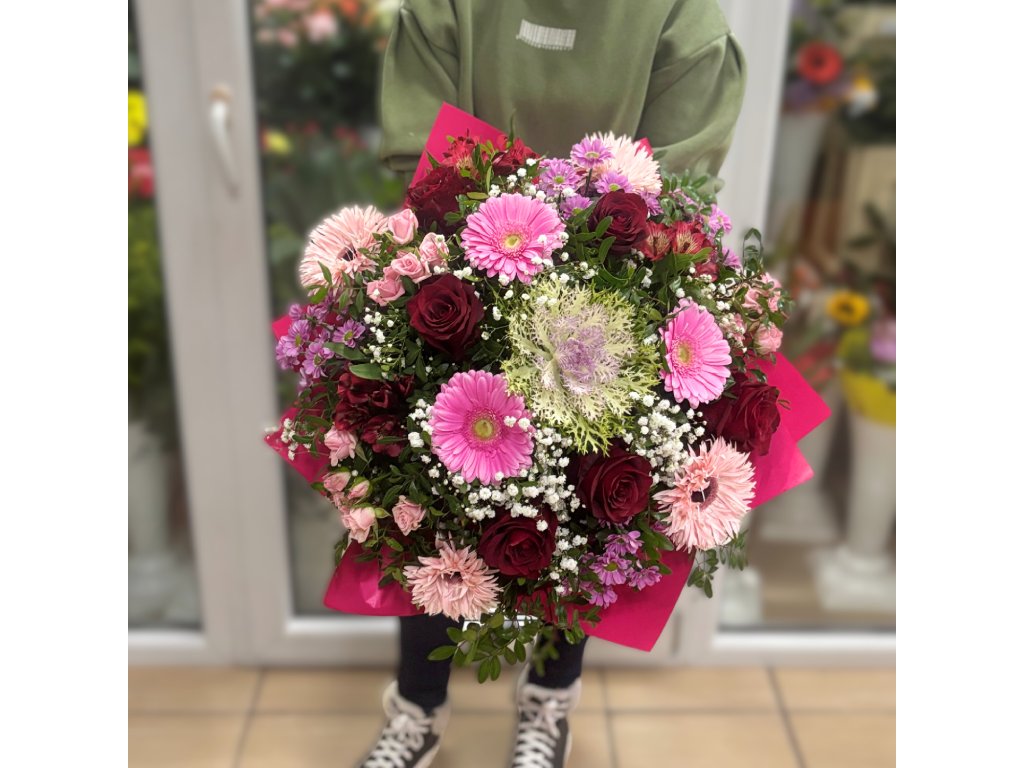 Kytica je zložená z brassici, 7 ružových gerbier, 6 červených ruží, 3 ružových mini ruží, 3 červených alstromérií, 3 ružových santin, gypsophily, pistácie ukončená je vodeodolným farebným papierom.