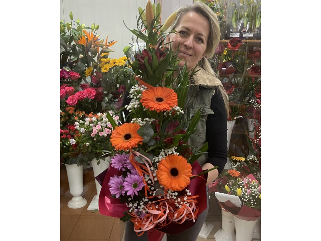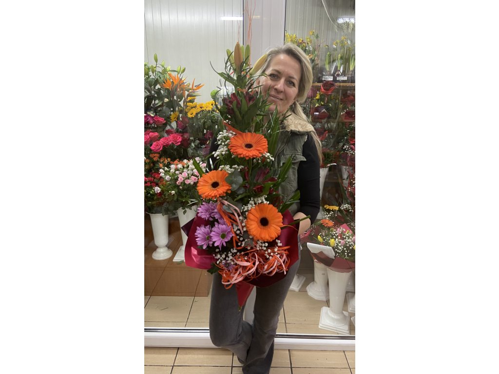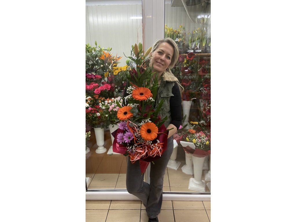 V tejto kytici sa prelínajú oranžové gerbery, červené ľalie, fialové chryzantémy a biele gypsophily, ktoré spolu tvoria dokonale vyvážený celok.