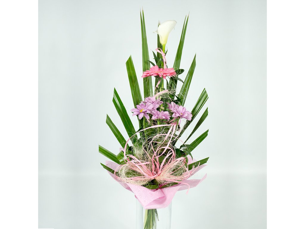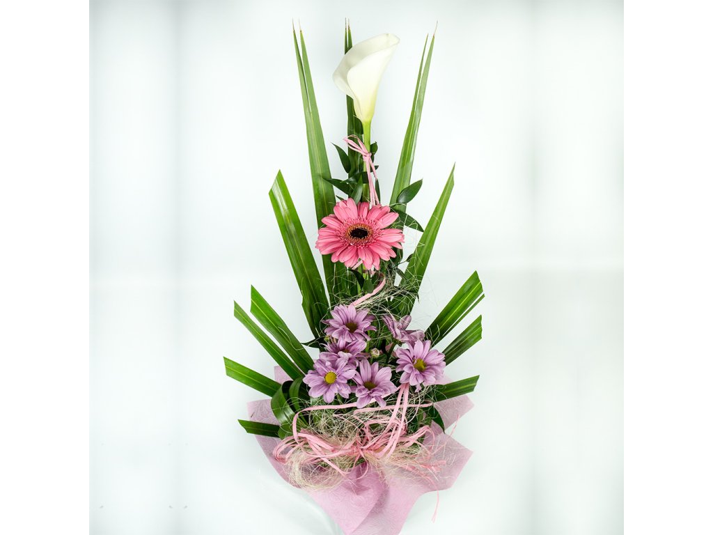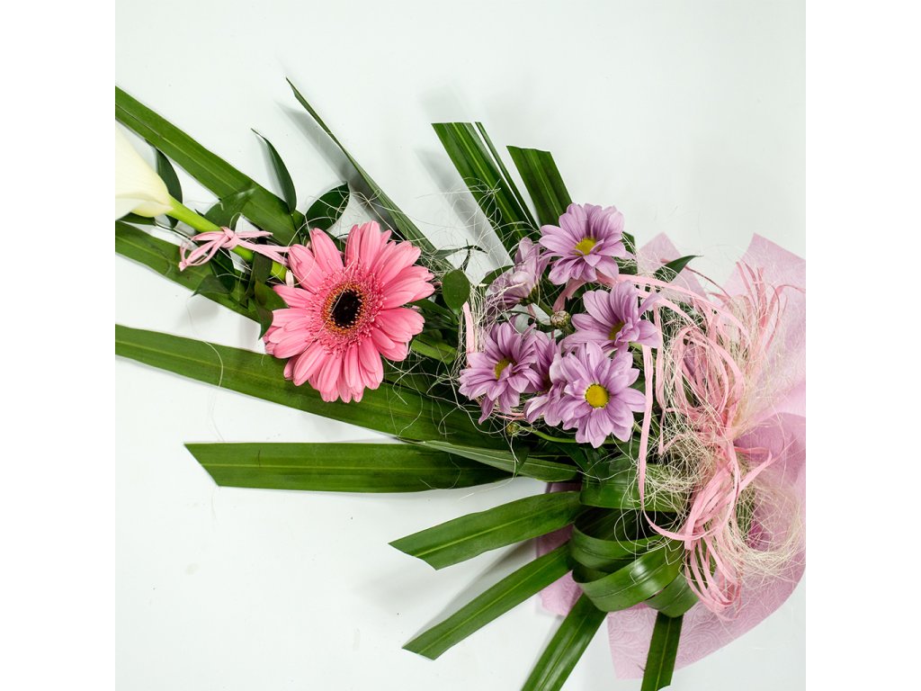 Kytica je zložená z bielej kaly, ružovej gerbery, ružovej chryzantény, palmového listu, ruscusu, mašle ukončená vodeodolným fatebným papierom.