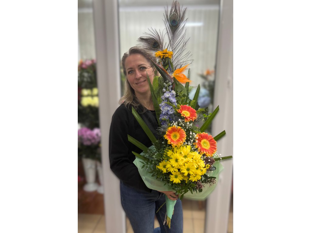 Kytica je zložená z 2 pávích pierok, slnečnice, strelítzie, modrého delphínia, 3 oranžových gerbier, žltej chryzantény, palmového listu, žltého solidaga, gypsophily, pistácie, eringia ukončená vodeodolným farebným papierom.