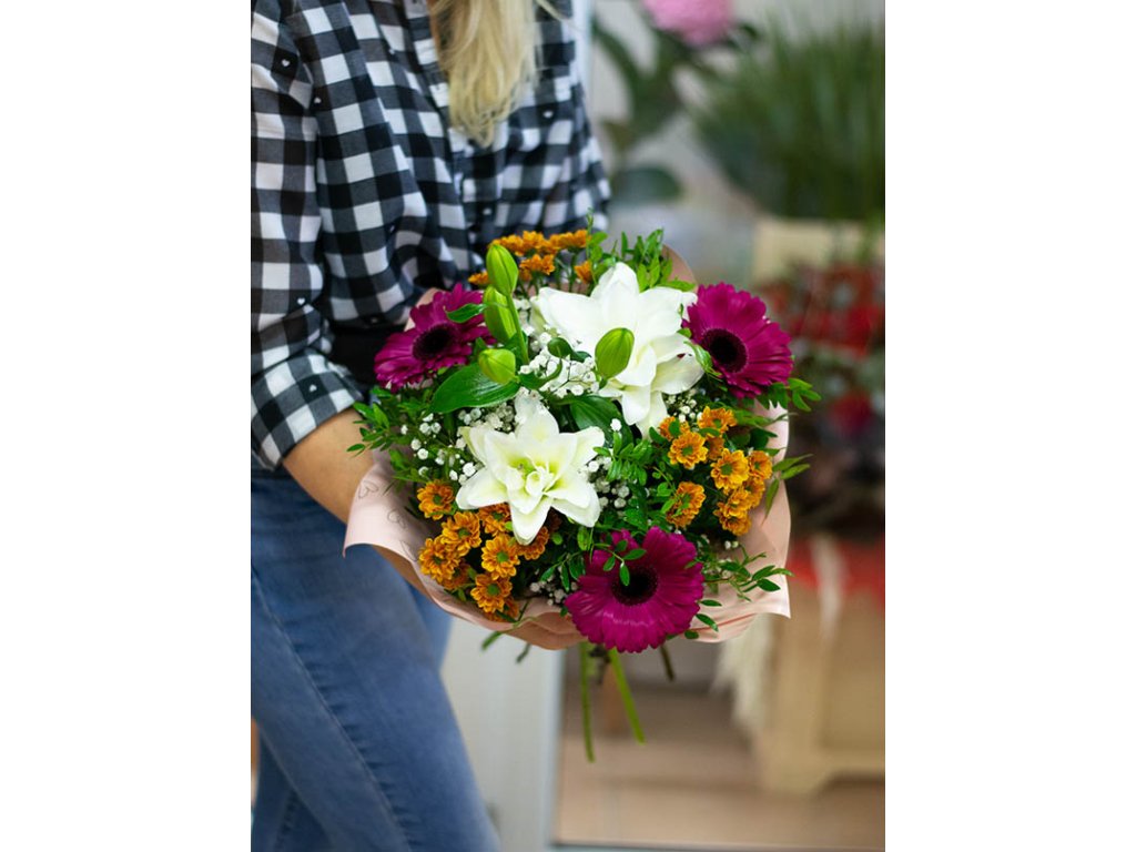 Kytica je zložená z bielej kráľovskej ľalie, 3 cyklamenových gerbier, 3 oranžových santín, gypsophily, pistácie ukončená vodeodolným farebným papierom.