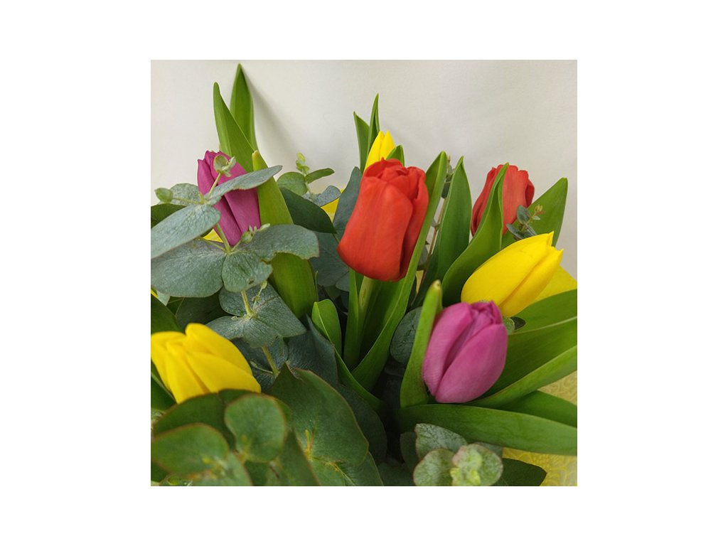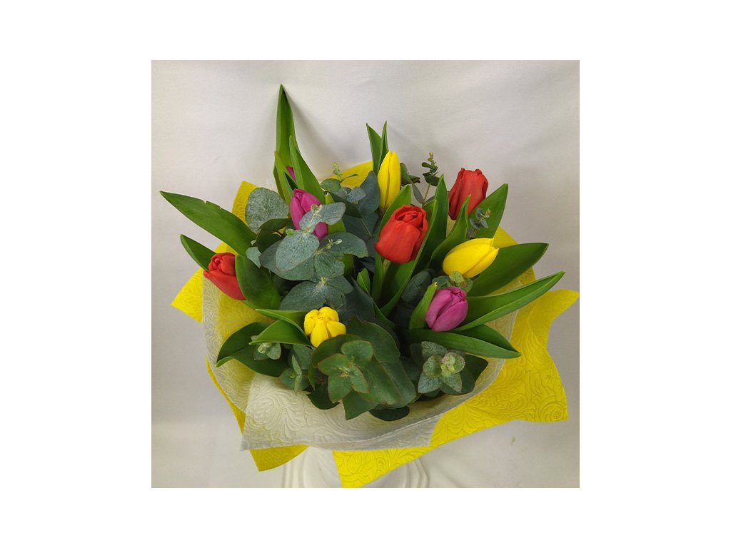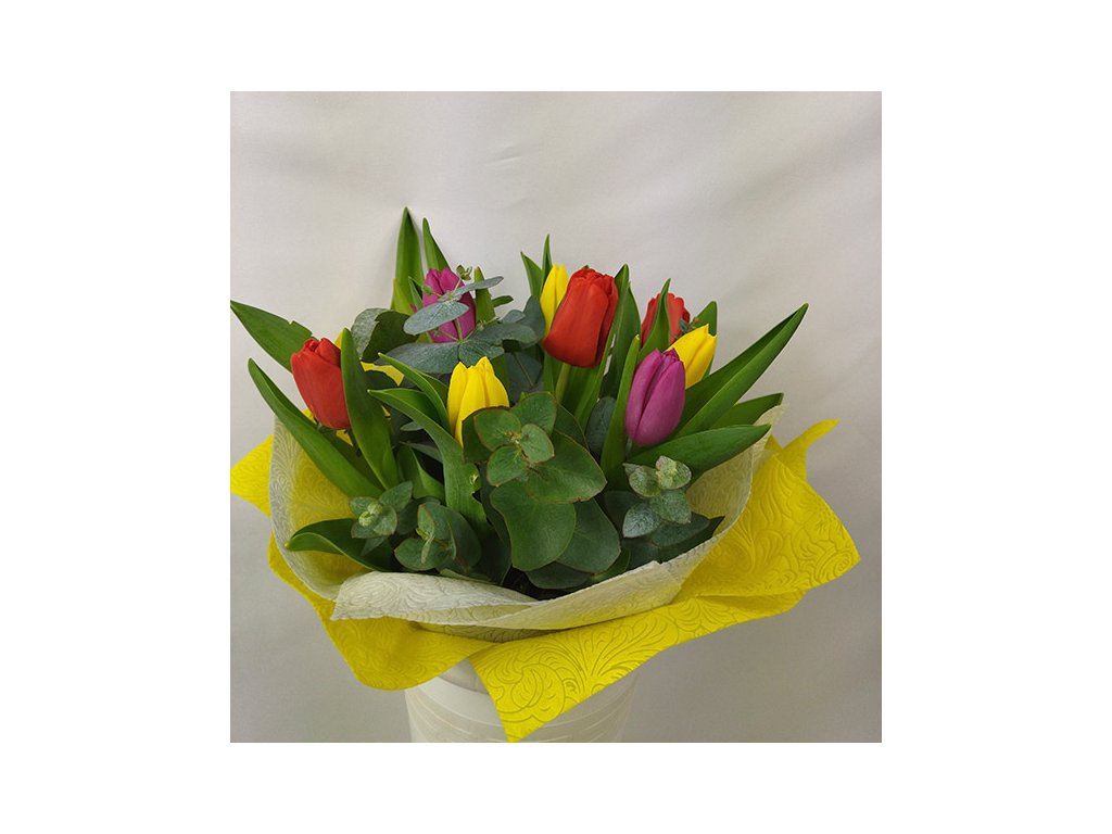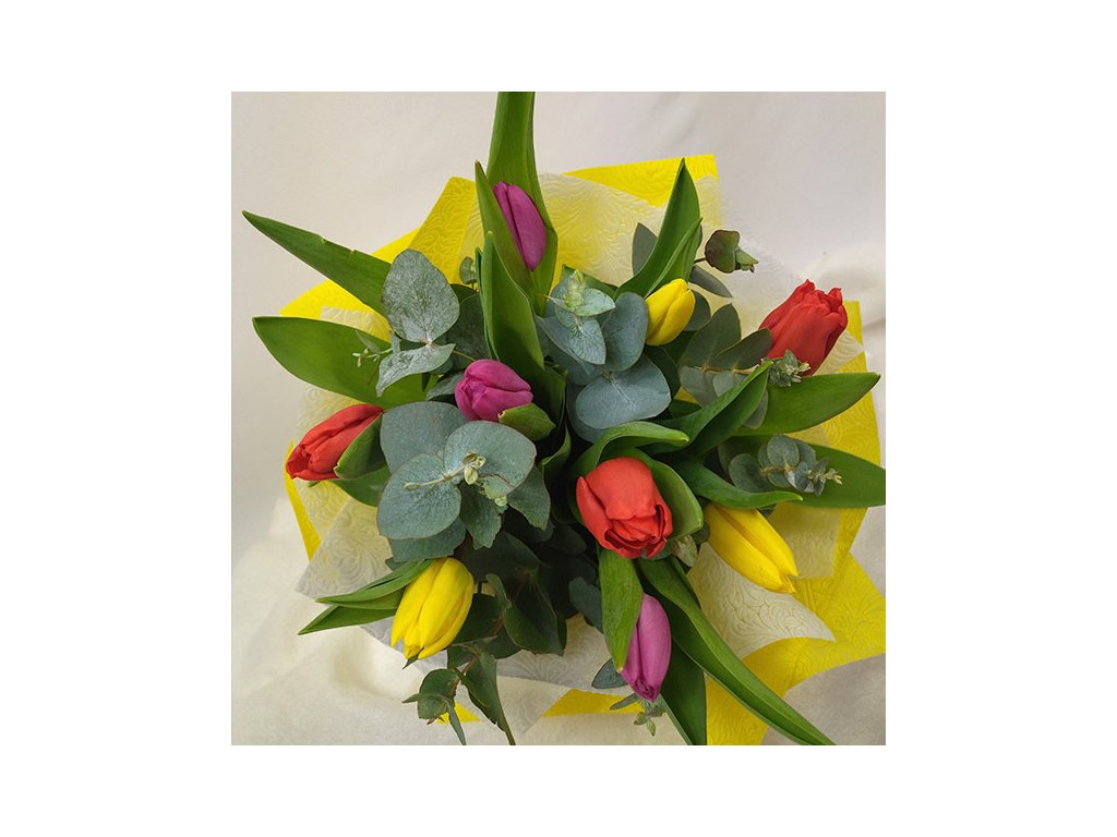 Kytica je zložená z 9 farebných tulipánov, eucalyptusu ukončená vodeodolným farebným papierom.