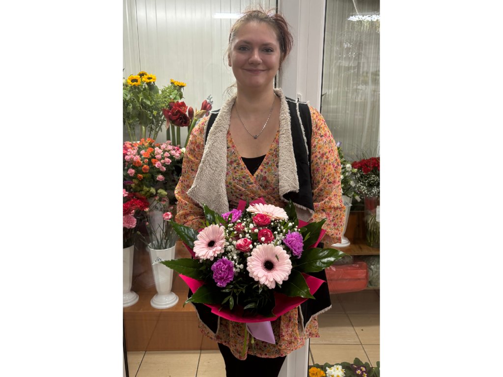 Kytica je zložená z cyklamenovej mini ruže, 3 cyklamenových karafiátov, 3 ružových gerbier, gypsophily, pistácie, arálie ukončená vodeodolným farebným papierom.