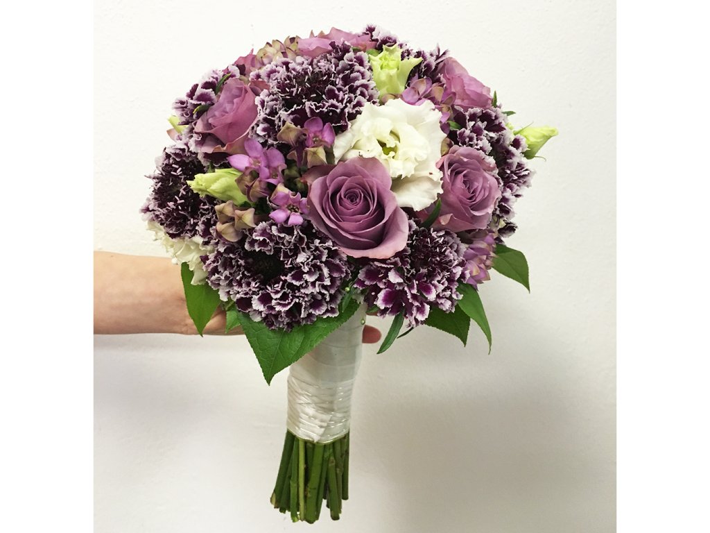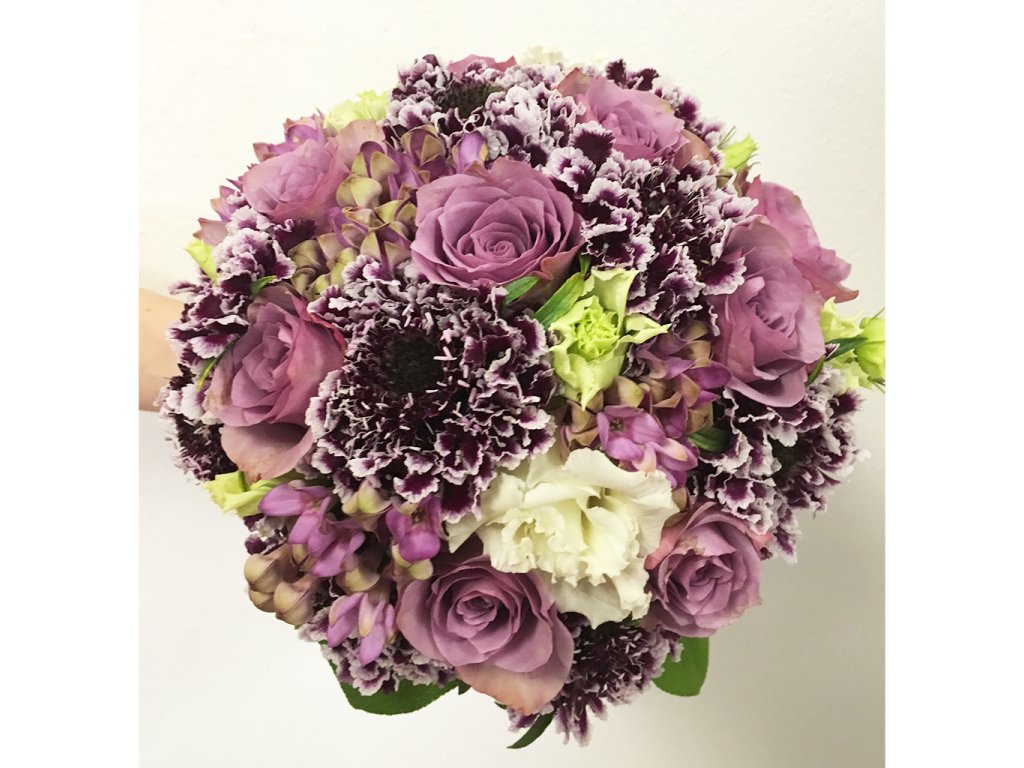 Fialová kytica so scabiózou je zložená z fialových ruží, bielej eustomy, fialovej bouvardie, fialovej scabiózi, zelene a doplnkov.