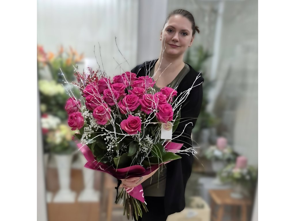 Kytica je zložená z 19 cyklamenových ruží, gypsophily, konárikov betule, beargrassu, aspidistrou ukončená vodeodolným farebným papierom.