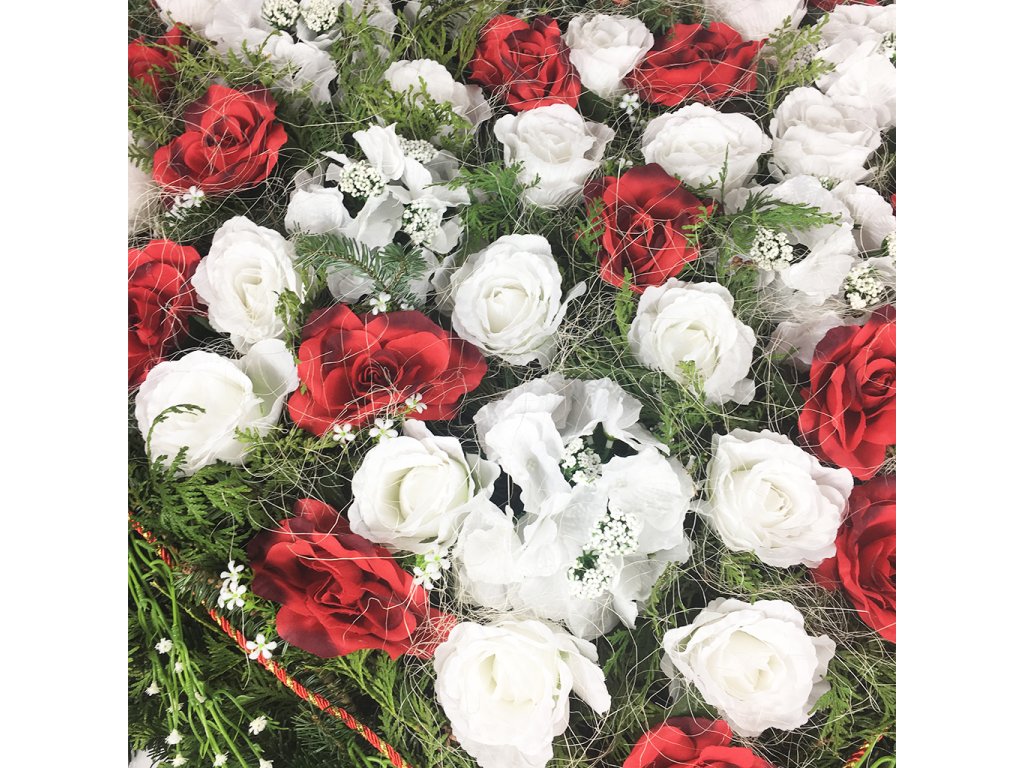 Veniec je zložený zo živého čačinového základu v tvare srdca, bielych a červených umelých ruží, bielych umelých hortenzií, uemelej gypsophily a doplnkov.