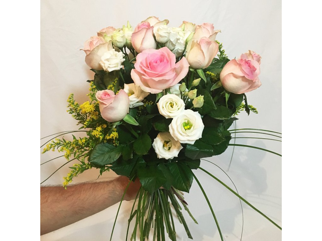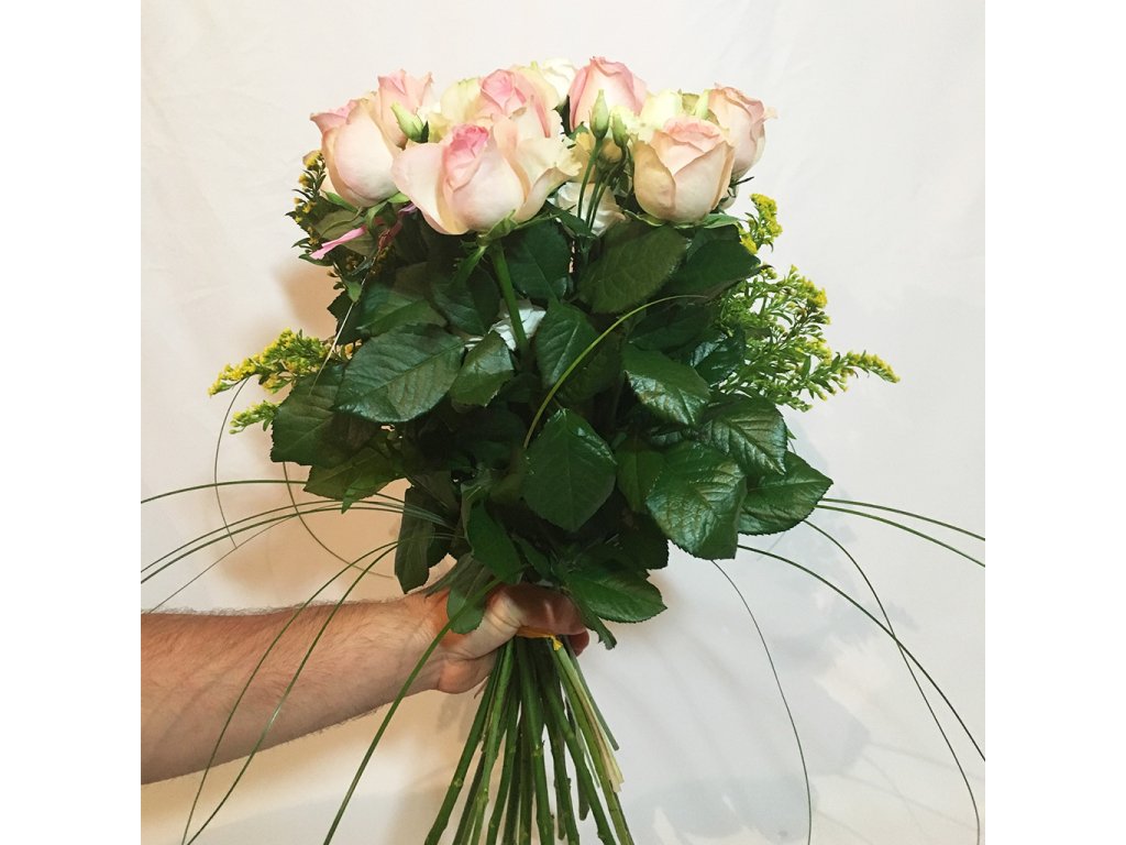 Kytica je viazaná z 11 svetlo ružových ruží, 6 bielych eustom, solidága, beargrassu ukončená farebným úväzkom.