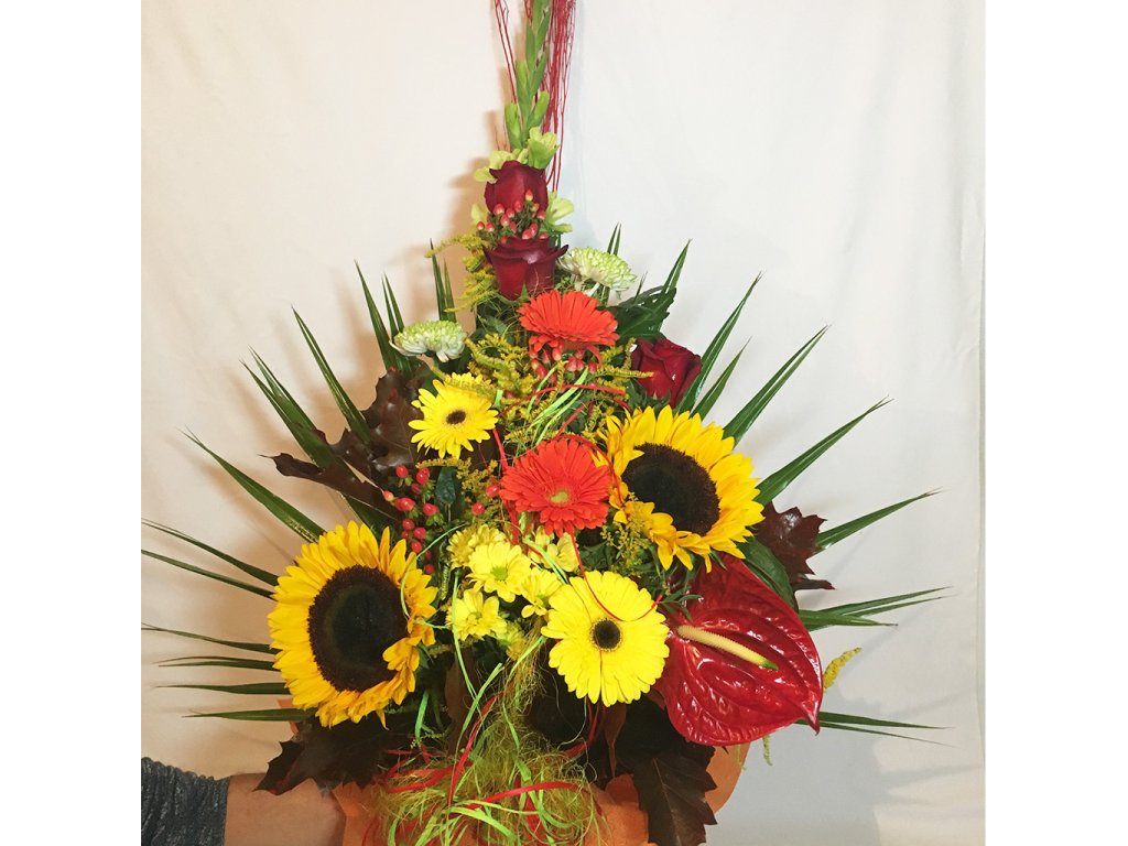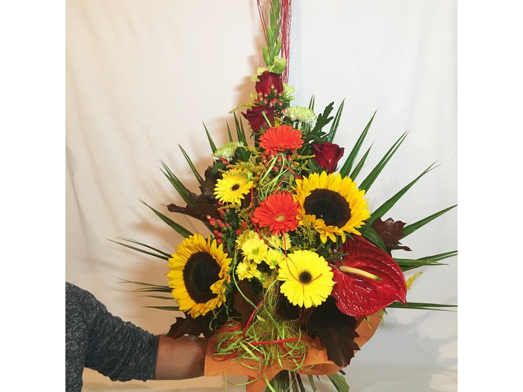Kytica je viazaná zo zelenej gladioly, 3 červených ruží, 2 zelených chryzantén, 2 oranžových a 2 žltých gerbier, 2 slnečníc, žltej chryzantény, červenej antúrie, palmového listu, farebného konára, hyperica, solidaga, querkusu, pistácie, mašle ukončená vodeodolným farebným papierom.