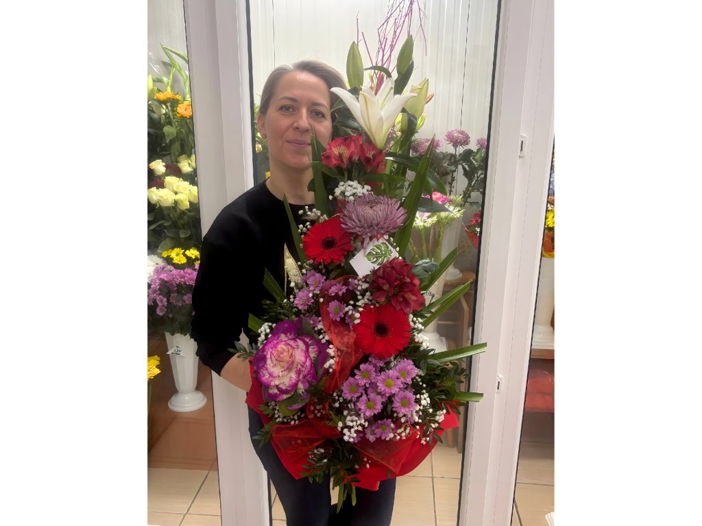 Kytica je zložená z bielej kráľovskej ľalie, 2 červených alstromérií, ružovej jednokvetej chryzantény, 2 červených gerbier, 2 ružových chryzantén, brassici, palmového listu, gypsophily, farebného konára, pistácie , organzovej stuhy ukončená vodeodolným farebným papierom.