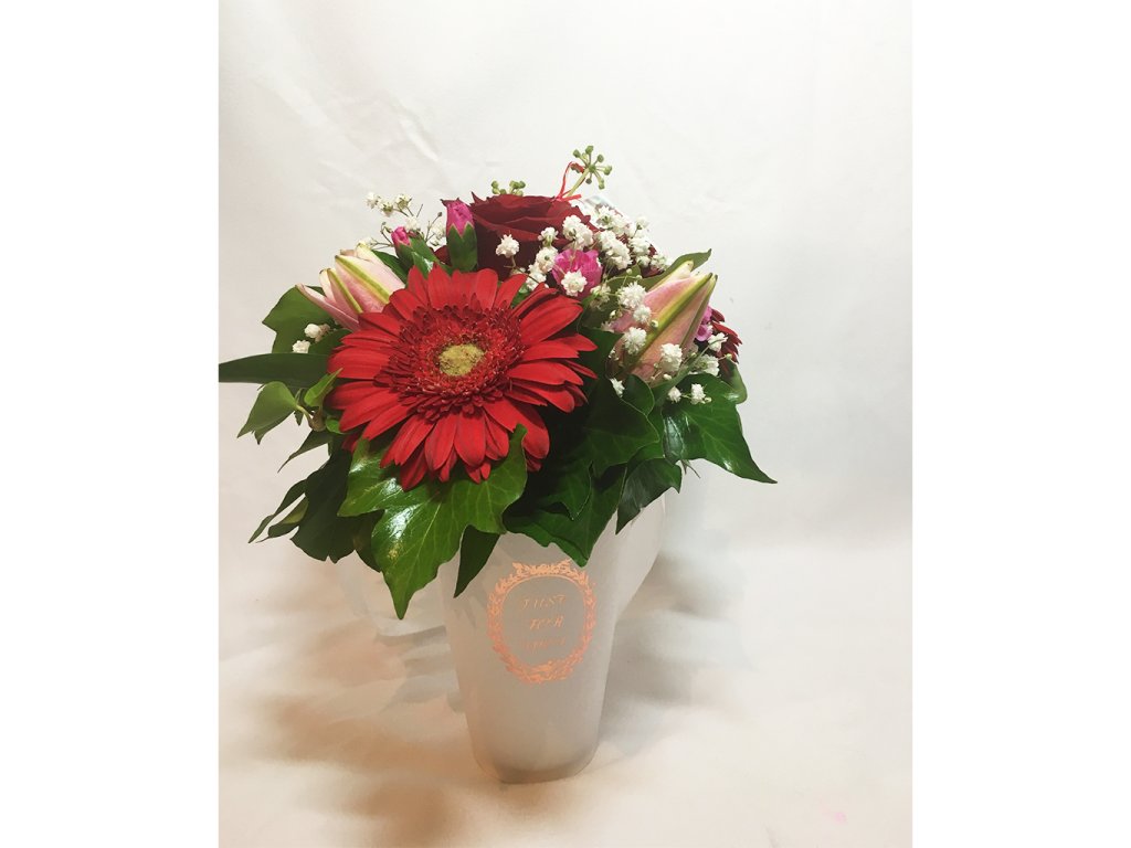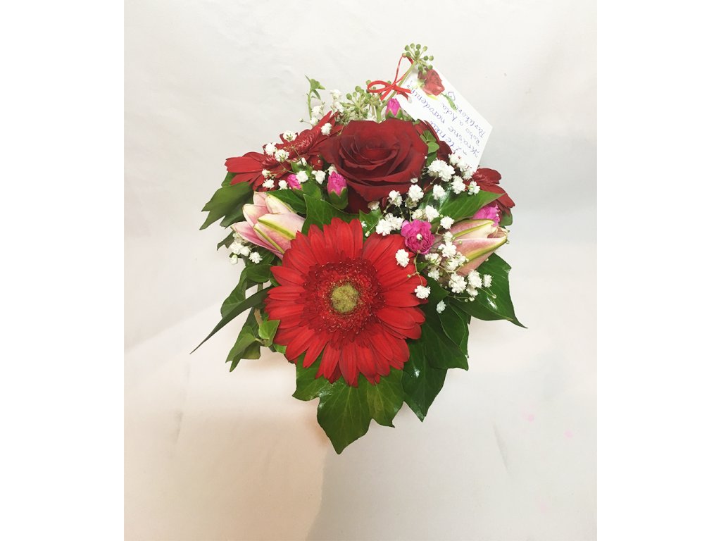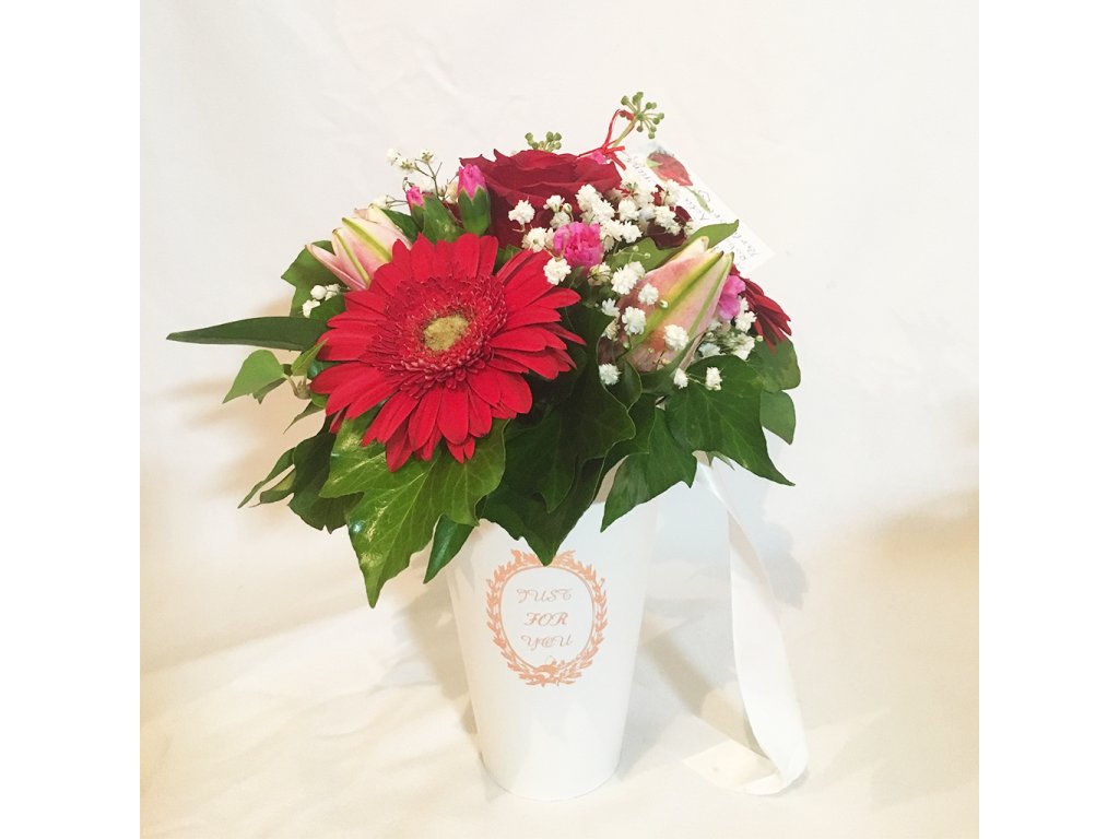 Zloženie: Box je aranžovaný z červenej gerbery, červenej ruže, ružovej ľalie, cyklámenových mini karafiátov, gypsophily, zelene a dekoračných doplnkov.