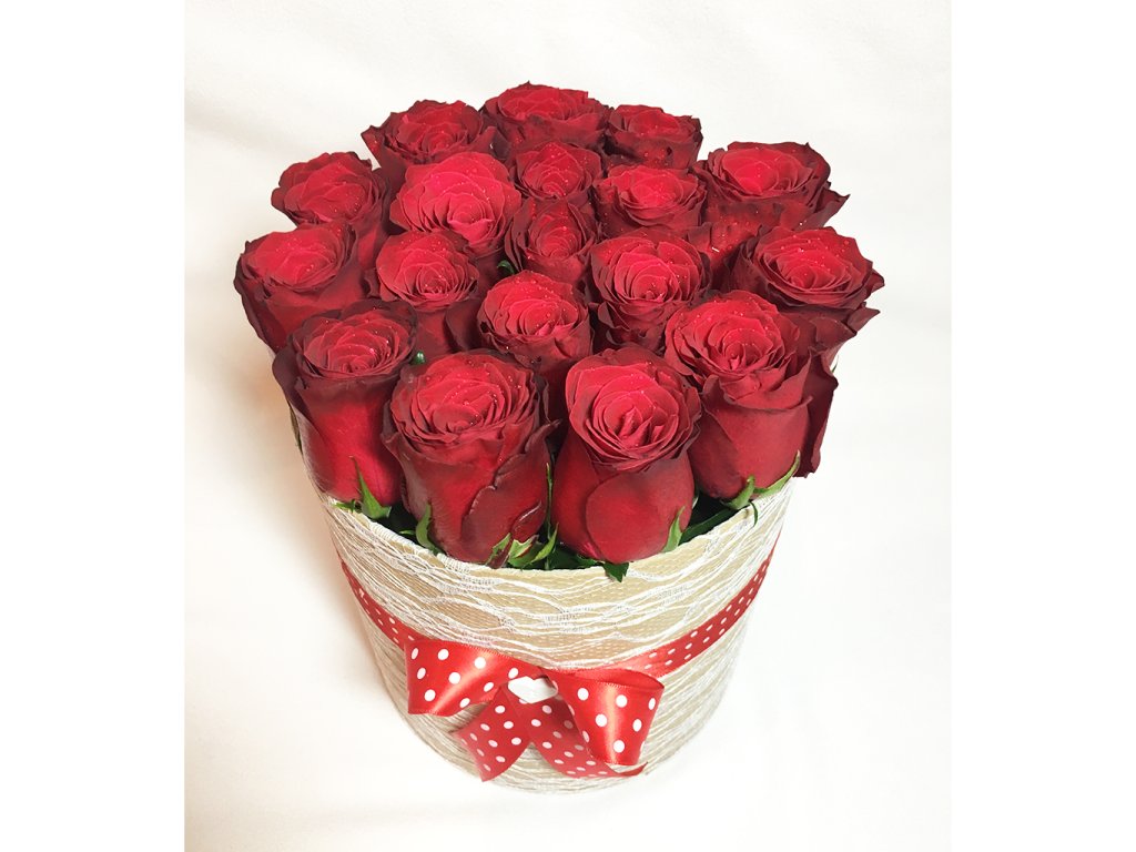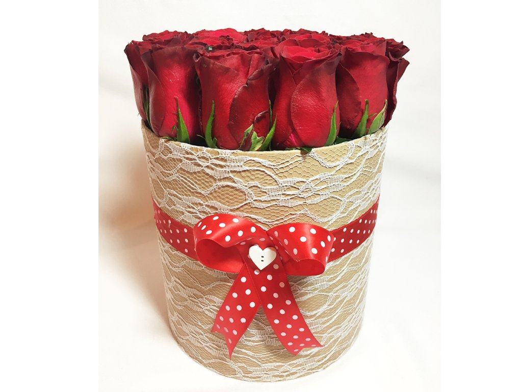 Kvetinový box je zložený z 18 červených ruží, okrúhleho boxu, florexu a doplnkov.