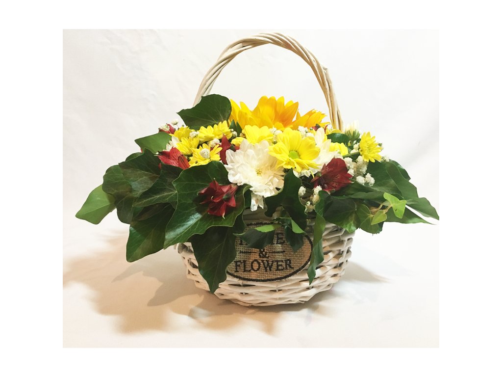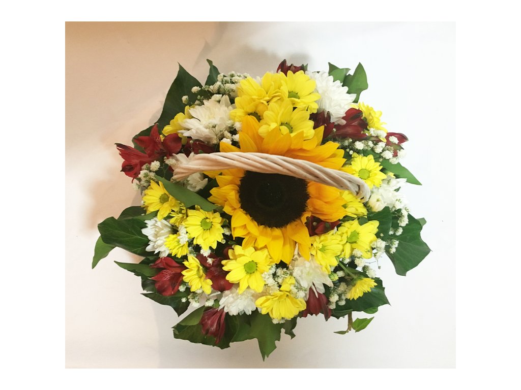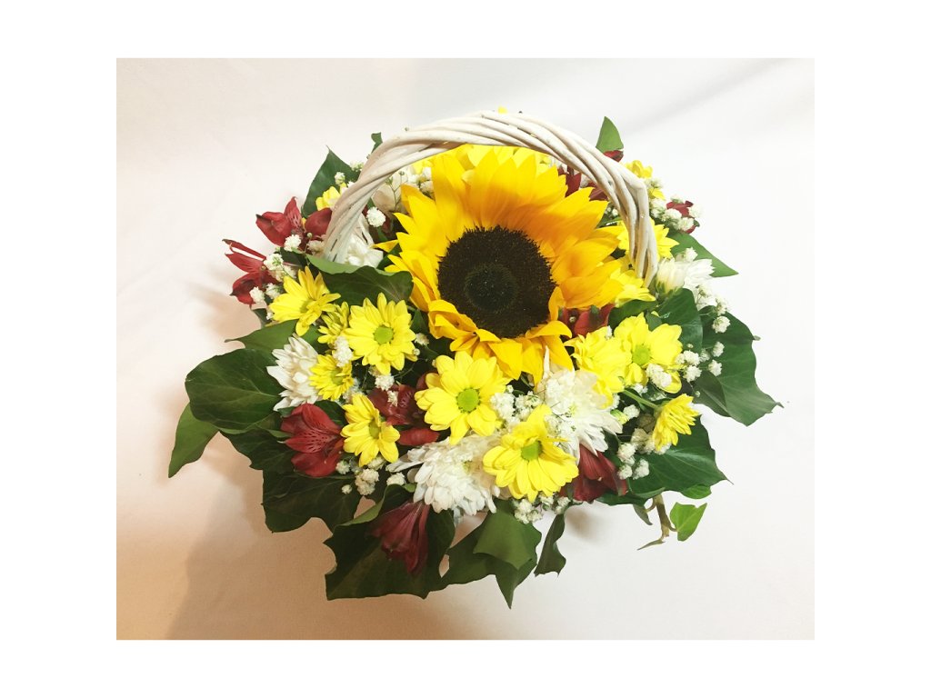 Košík je zložený zo slnečnice, 1 bielej a 2 žltých chryzantén, 2 červených alstromérií, gypsophily, zelene, košíka florexu.