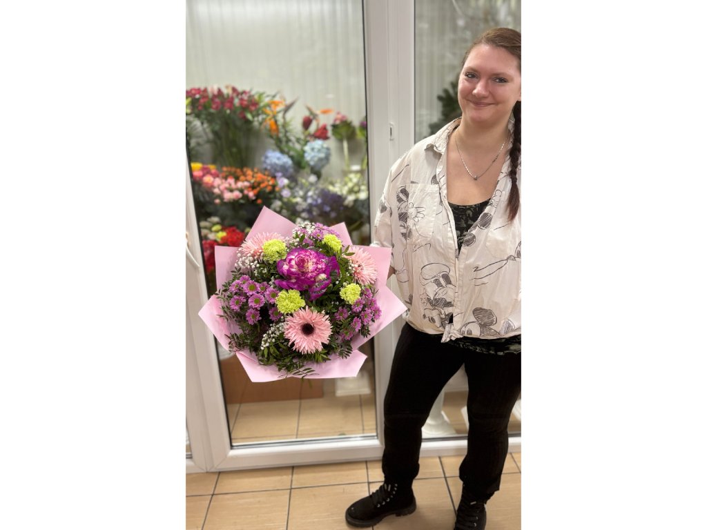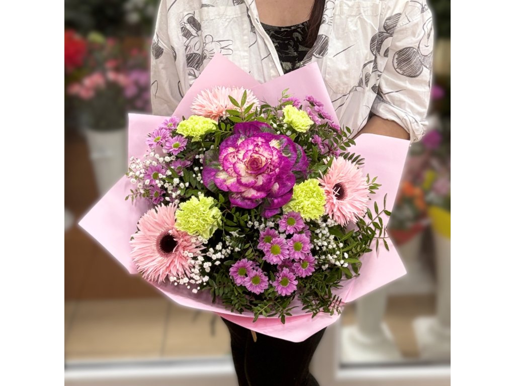 Kytica je zložená z brassici, 4 žltých karafiátov, 3 gerbier, 3 santín, gypsophily, pistácie ukončená vodeodolným farebným papierom.