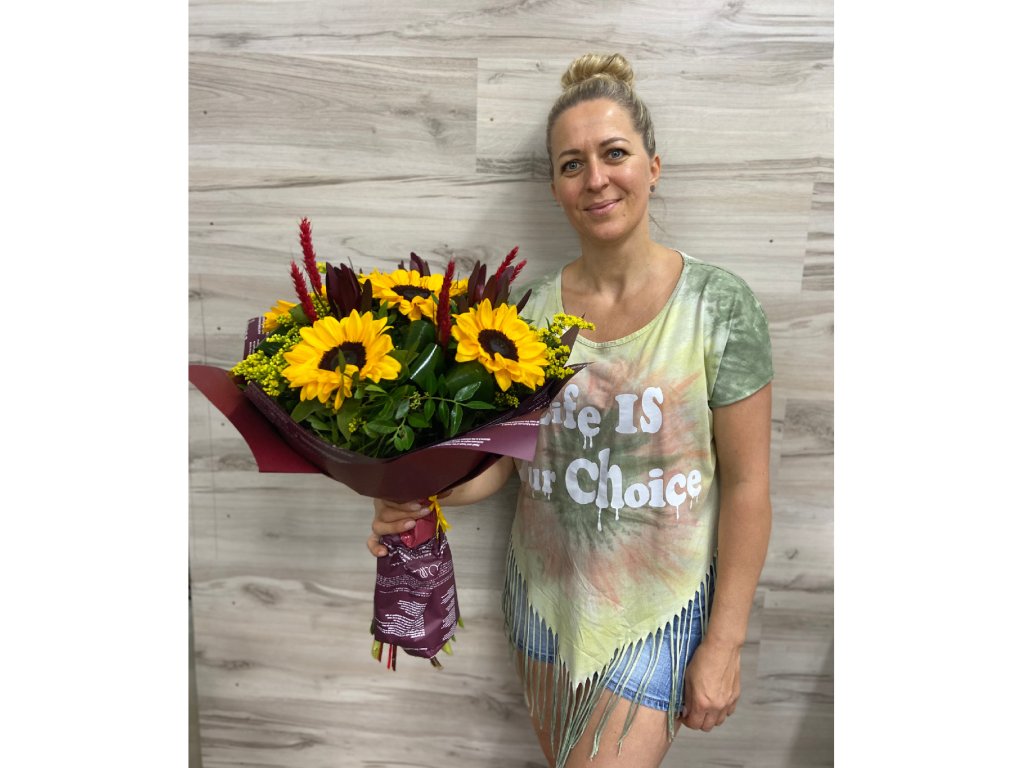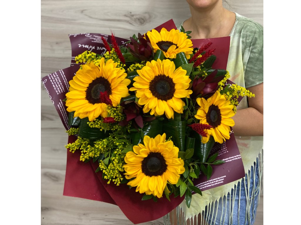 Kytica je zložená z 5 slnečníc, leucadendrónu, aspidistry, solidaga, pistácie, kláskov, ukončená vodeodolným farebným papierom.