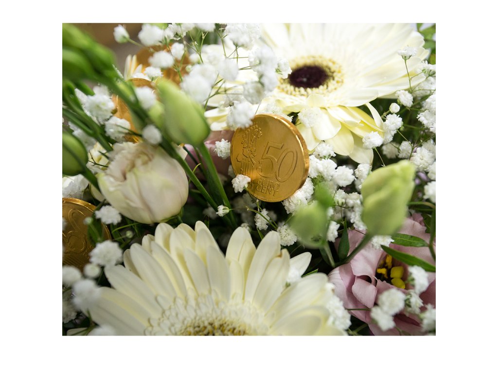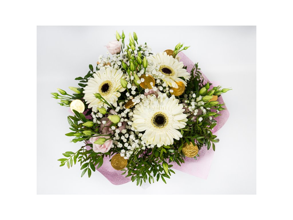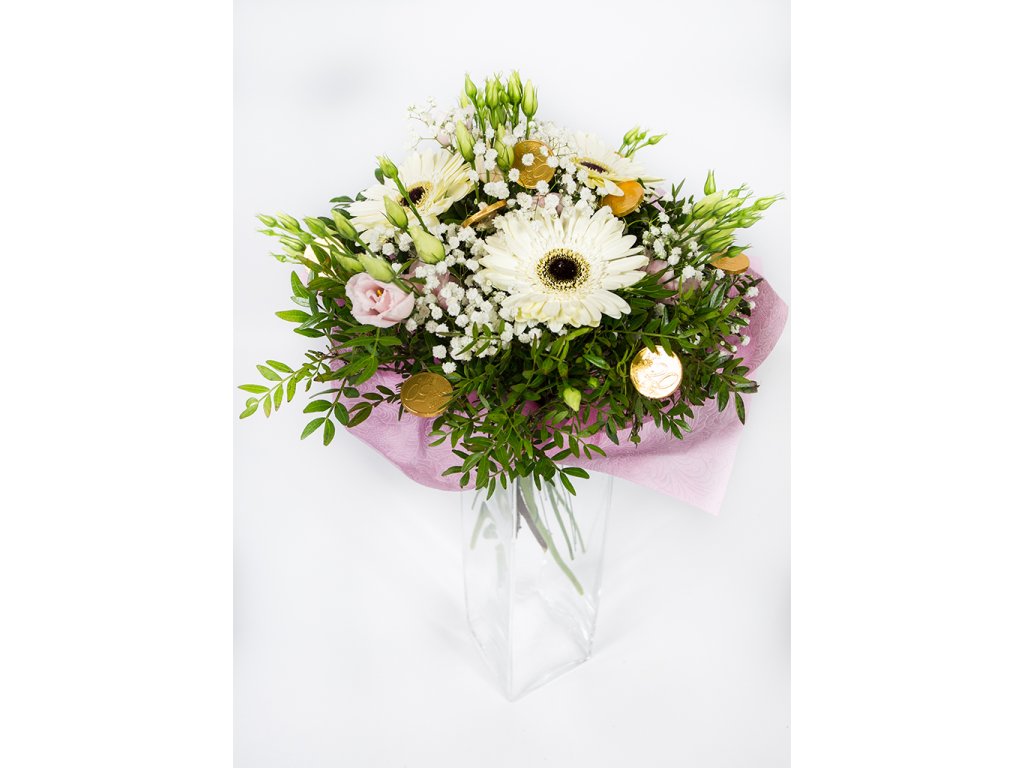 Kytica je zložená z 3 bielych gerbier, 4 svetlo rúžových eustom, bielej gypsophily, pistácie, čokoládových mincí ukončená vodeodolným farebným papierom.