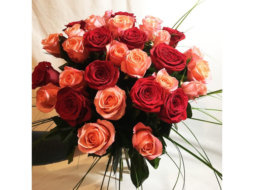 Kytica je viazaná z 11 červených ruží, 20 koralových ruží, beargrassu ukončená sisalovým úväzkom.
