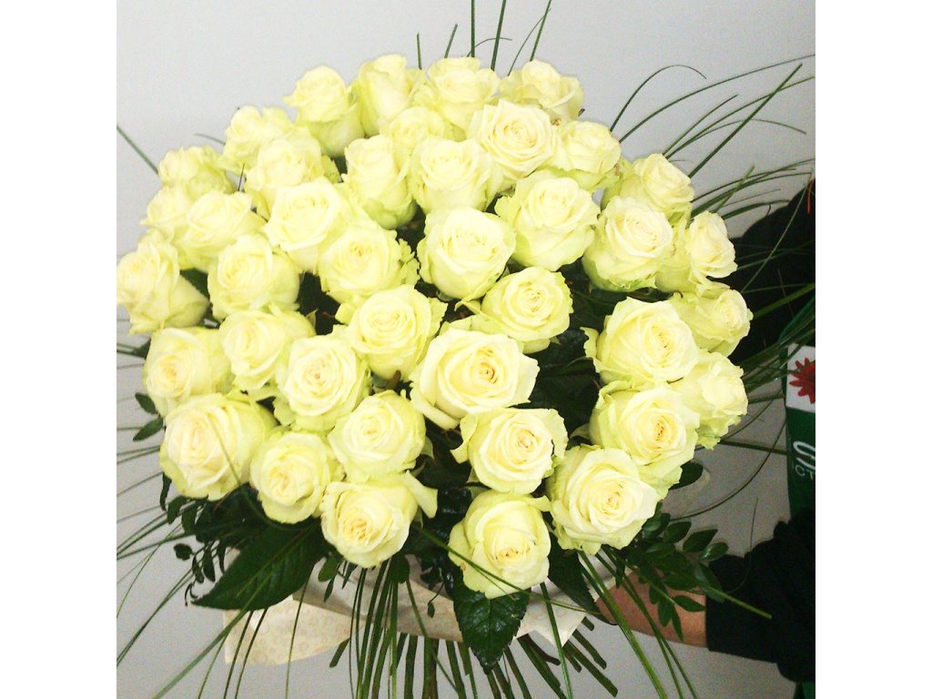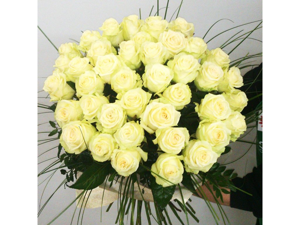 Kytica je zložená z 50 bielych ruží, beargrassu, pistácie, arálie ukončená bielou organzovou stuhou.