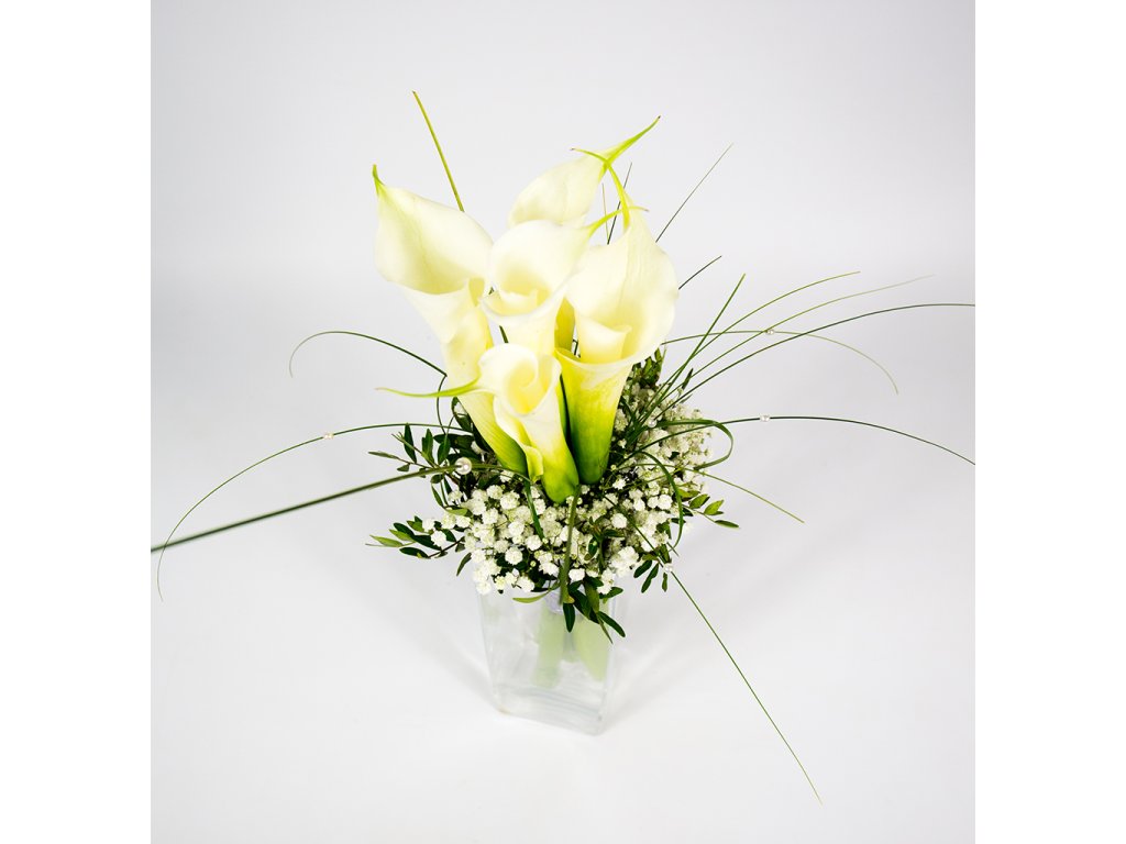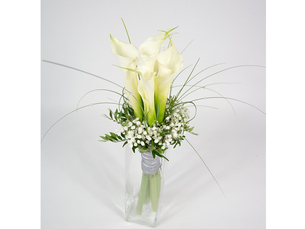 Kytica z bielych kál je zložená z bielych kál, gypsophily, pistácie, beargrassu a doplnkov.