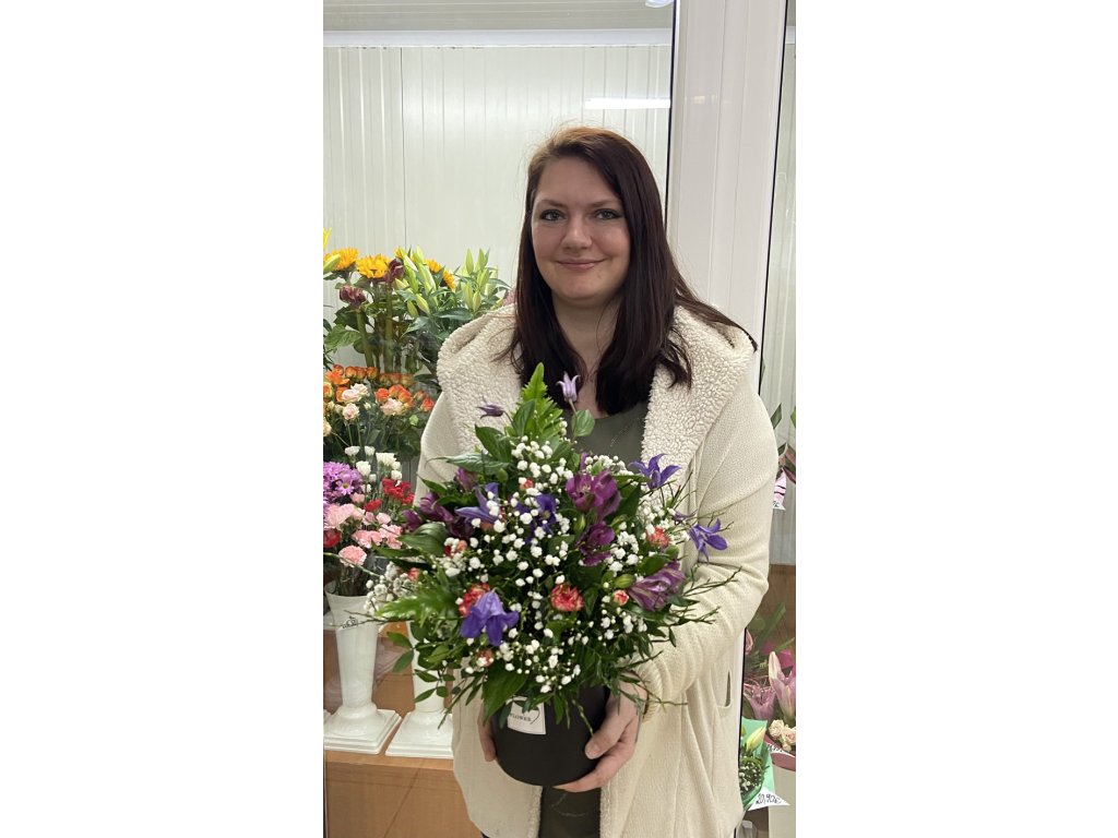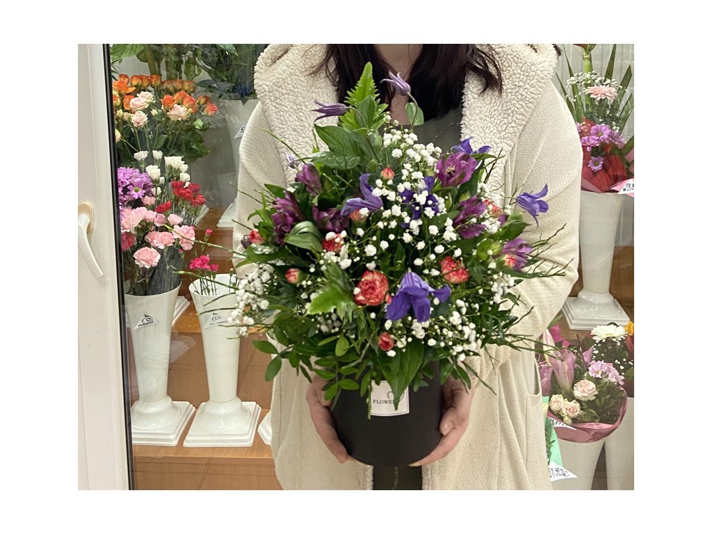 Kytica je aranžovaná do štýlového okrúhleho boxu, ktorý dodáva celej kompozícii moderný a elegantný vzhľad. Obsahuje fialové kvety (pravdepodobne clematis alebo alstromérie), doplnené malými červenými kvetmi karafiátov a bielou gypsophilou (nevestin závoj). Bohatá zelená výplň dotvára objem a sviežosť, vďaka ktorej pôsobí kytica prirodzene a nadýchane.