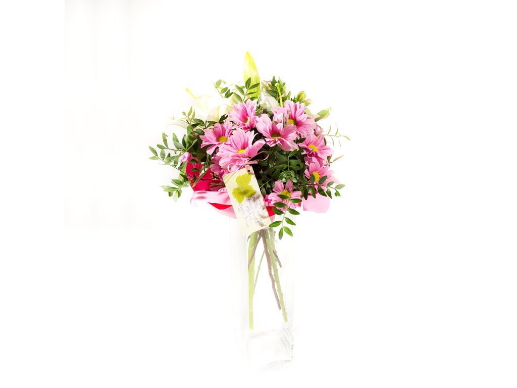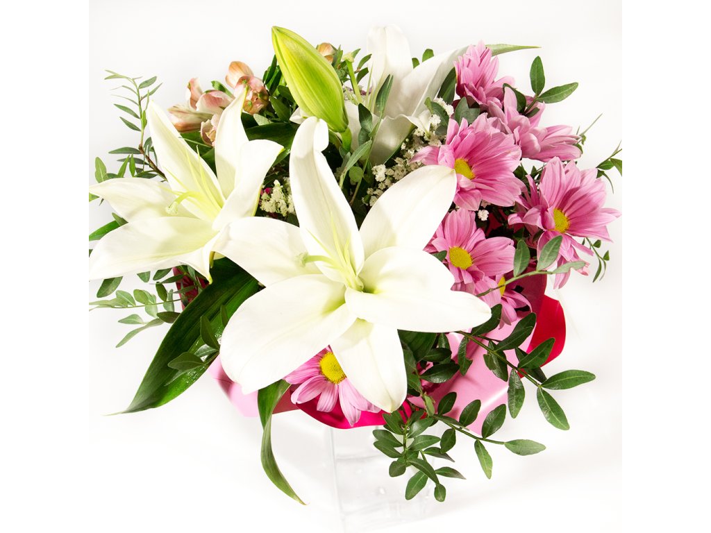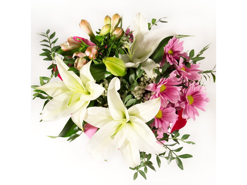 Kytica je viazaná z bielej kráľovskej ľálie, ružovej chryzantény, ružovej alstromérie, pistácie, gypsophily ukončená vodeodolným farebným papierom.