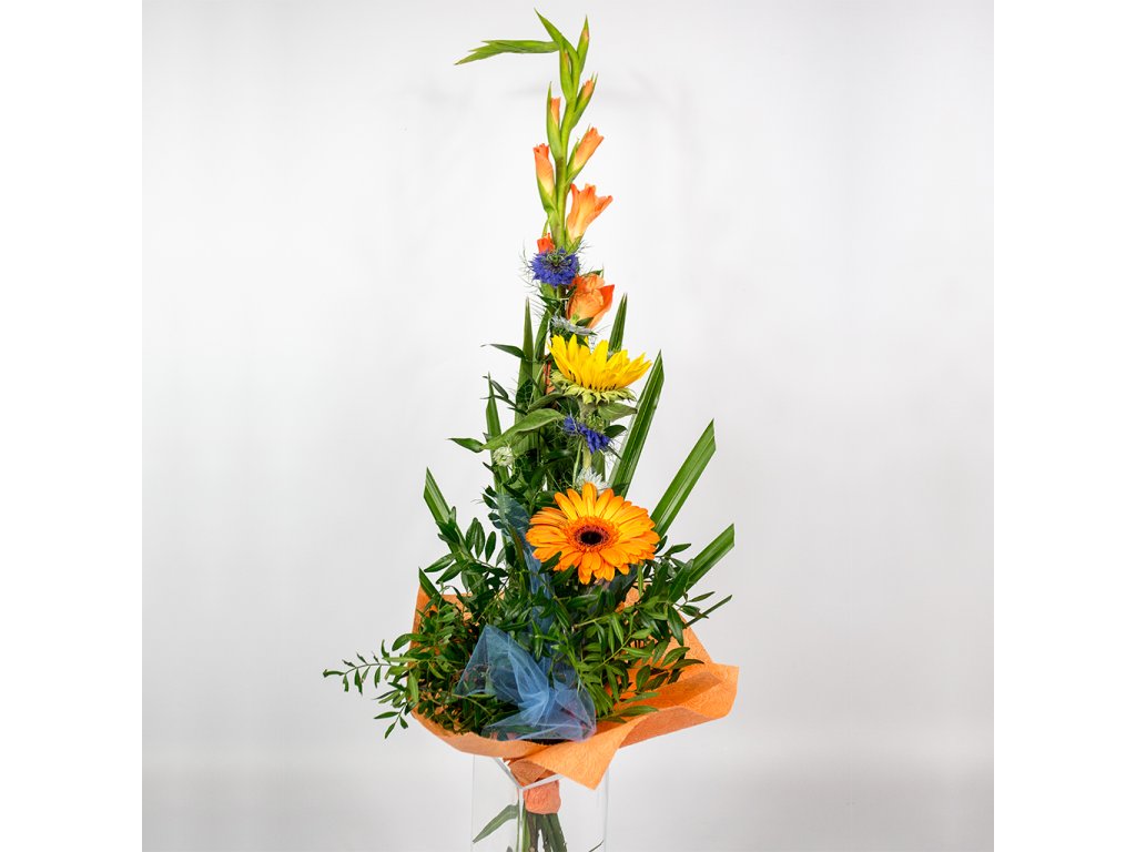 Kytica je viazaná z oranžovej gladioly, slnečnice, oranžovej gerbery, palmového listu, pistácie, modrej nigelly, organzovej mašle ukončená vodeodolným farebným papierom.