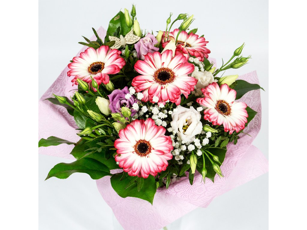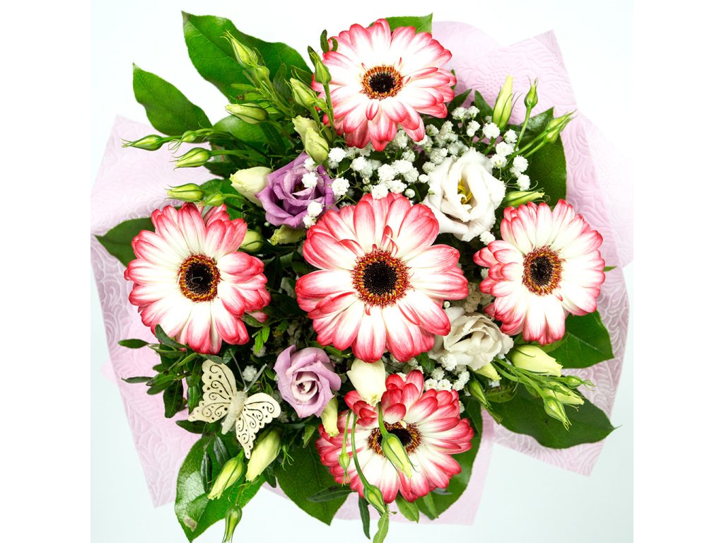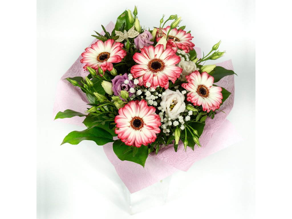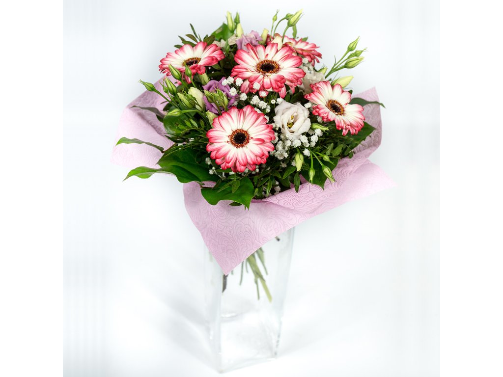 Kytica je viazaná z 5 bielo ružových mini gerbier, 4 fialových eustom, pistácie, salalu, gypsophily ukončená vodeodolným farebným papierom.