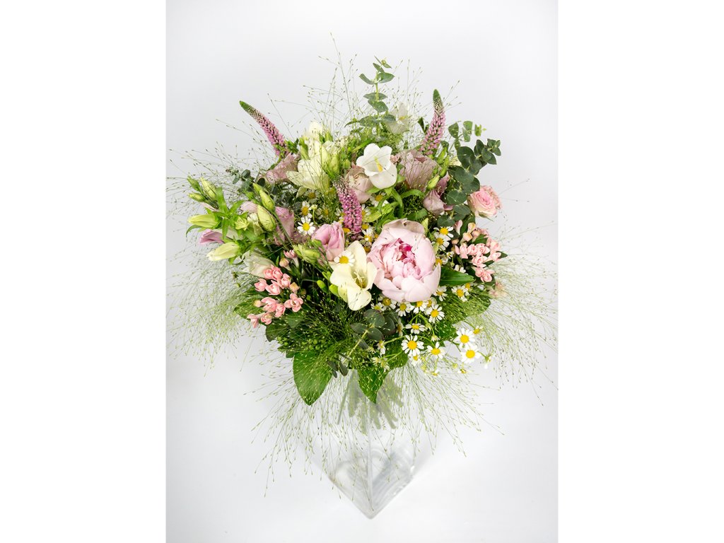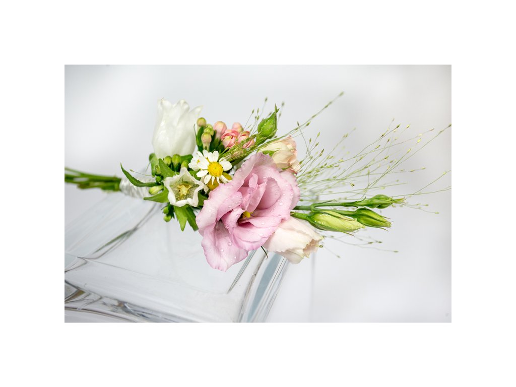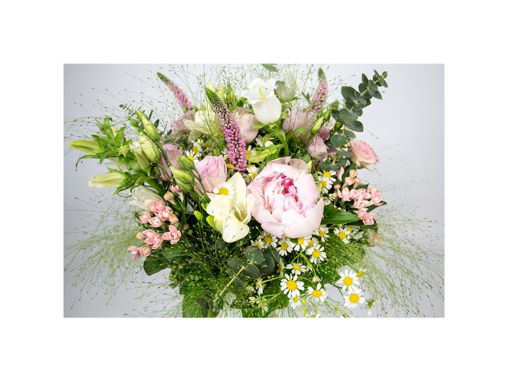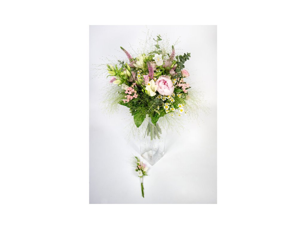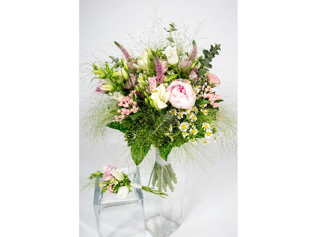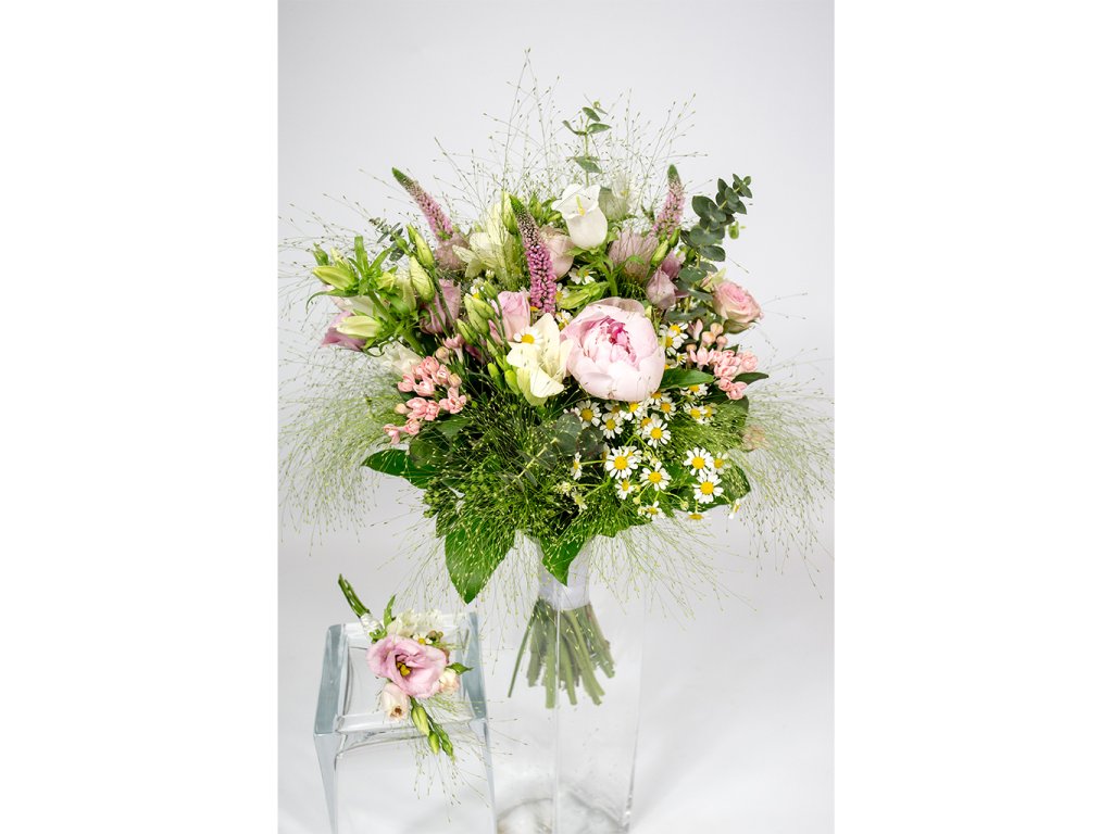 Kytica je zložená z 3 ružových pivónií, 3 ružových bouvardií, 3 bielych zvončekov, 3 bielych frézií, 3 ružových eustom, 2 ružových mini ruží, eucalyptu, tanaceta, panica, salalu, veroniky ukončená stuhou.