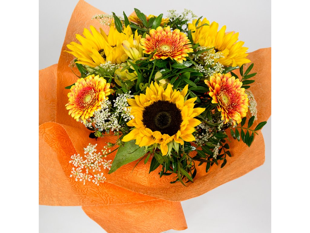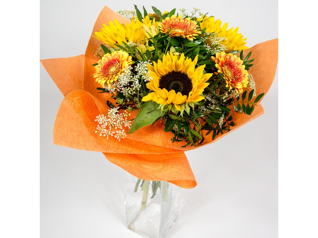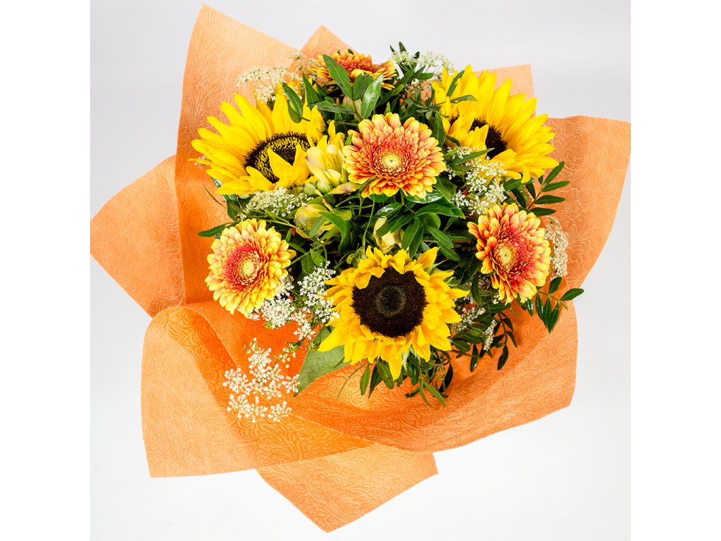 Kytica je zložená z 3 slnečníc, 4 oranžových mini gerbier, 2 žltých alstromerií, bielej gypsophily, pistácie ukončená vodeodolným farebným papierom.