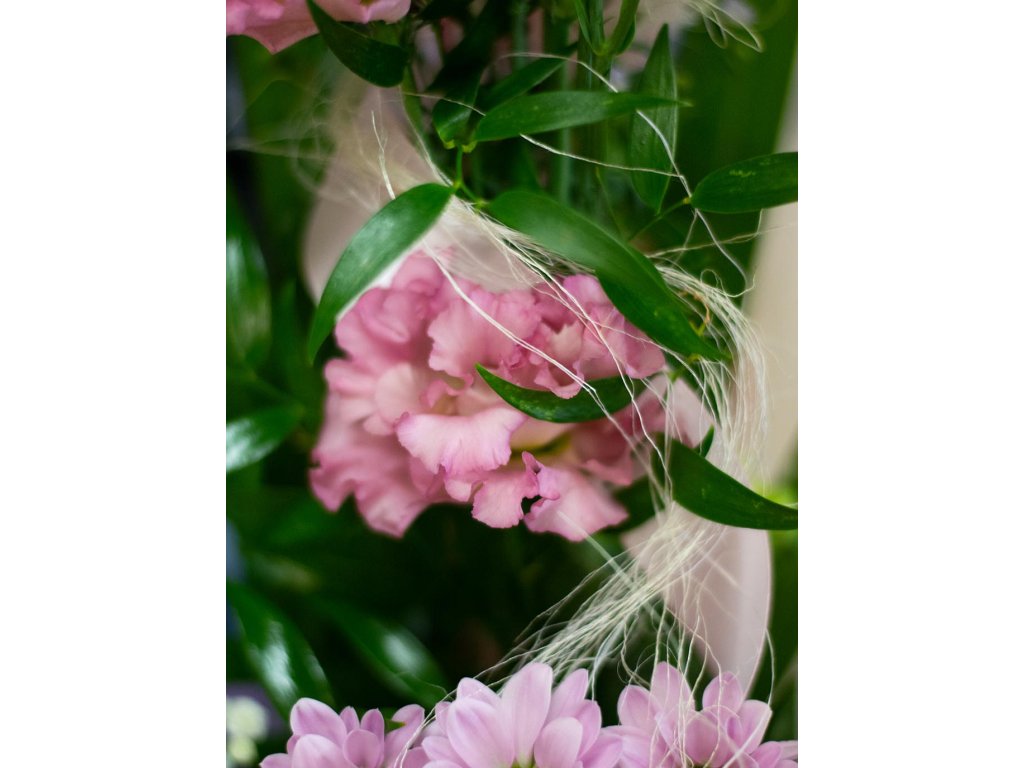 Kytica je zložená z ružovej kaly, ružovej eustomy, ružovej chryzantémy, gypsophily, fialového asteru, zelene a doplnkov.