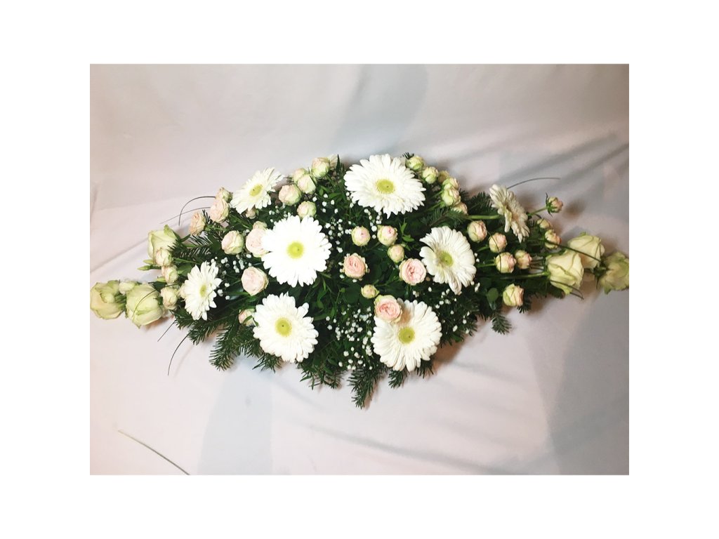 Smútočná ikebana na truhlu s bielymi gerberami a ružami