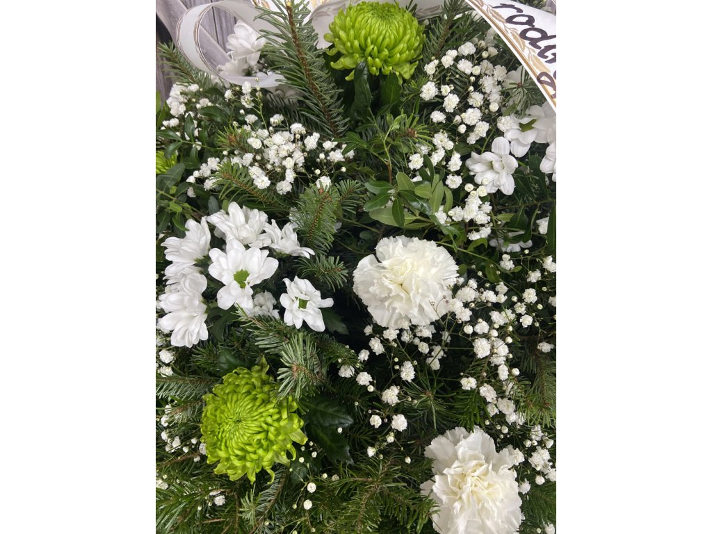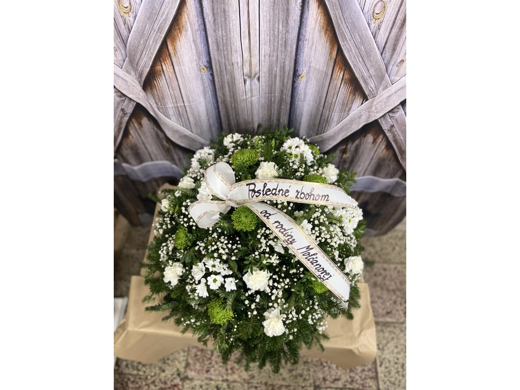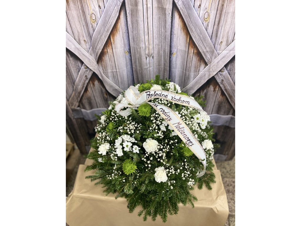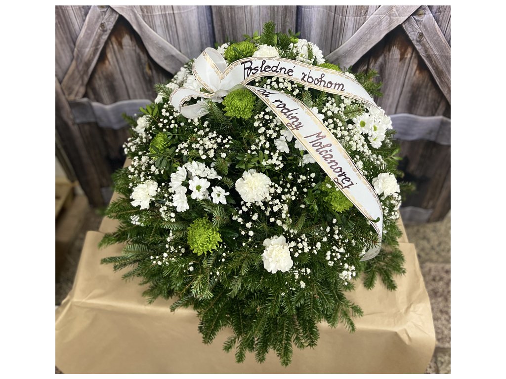 Smútočný veniec Bielo-zelená harmónia je viac než len kvetinová ozdoba – je to tichý prejav vďaky a spomienky. Vyjadruje všetko, čo zostáva nevyslovené – lásku, úctu, spomienky aj vďačnosť.