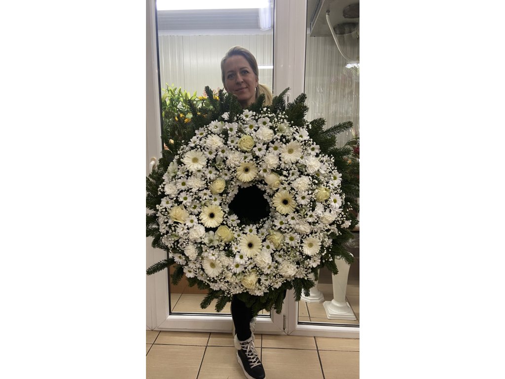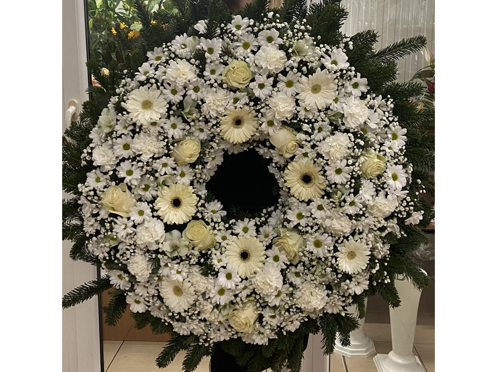 Veniec je aranžovaný z bielych ruží, gerbier, chryzantém, karafiátov a gypsophily, doplnených o tmavozelené smrekové vetvičky, ktoré vytvárajú kontrast a rám pre svetlé kvety. Celok pôsobí vyvážene, čisto a elegantne. Vďaka hustému a precíznemu viazaniu pôsobí veniec mohutne, no zároveň jemne a dôstojne. Jeho kruhový tvar symbolizuje večnosť, nekonečný kolobeh života a spomienku, ktorá pretrváva.