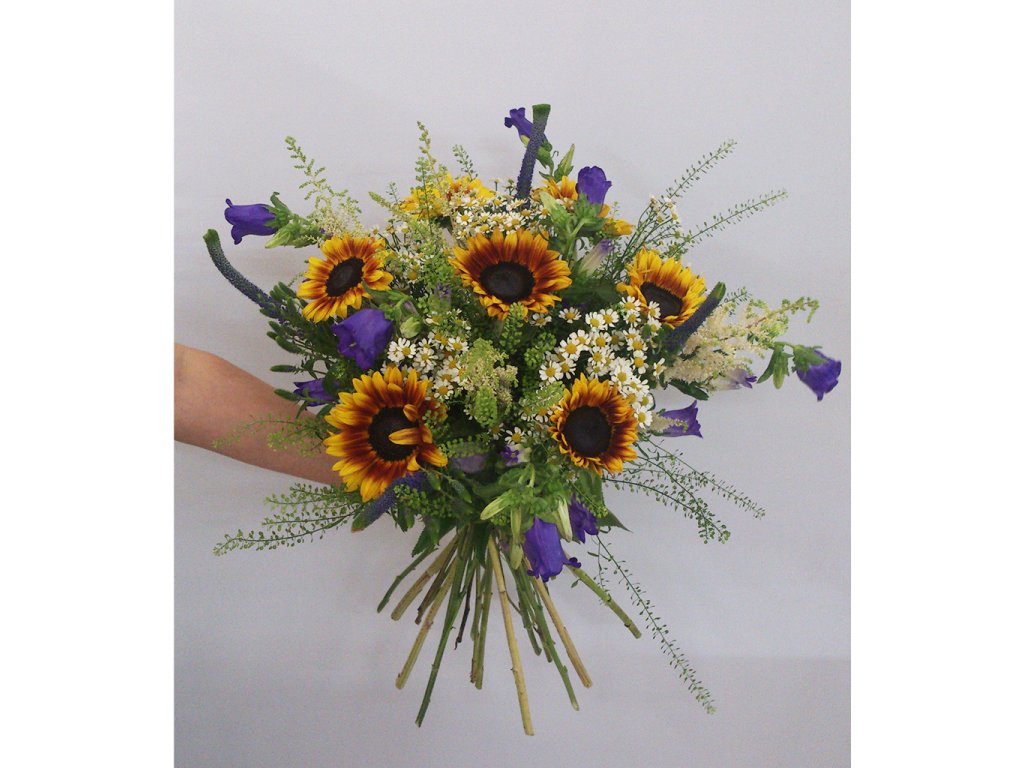 Poľná kytica je zložená zo slnečníc, thalaspi, fialová campanula, tanacetum, fialová veronika, zelene a doplnkov.
