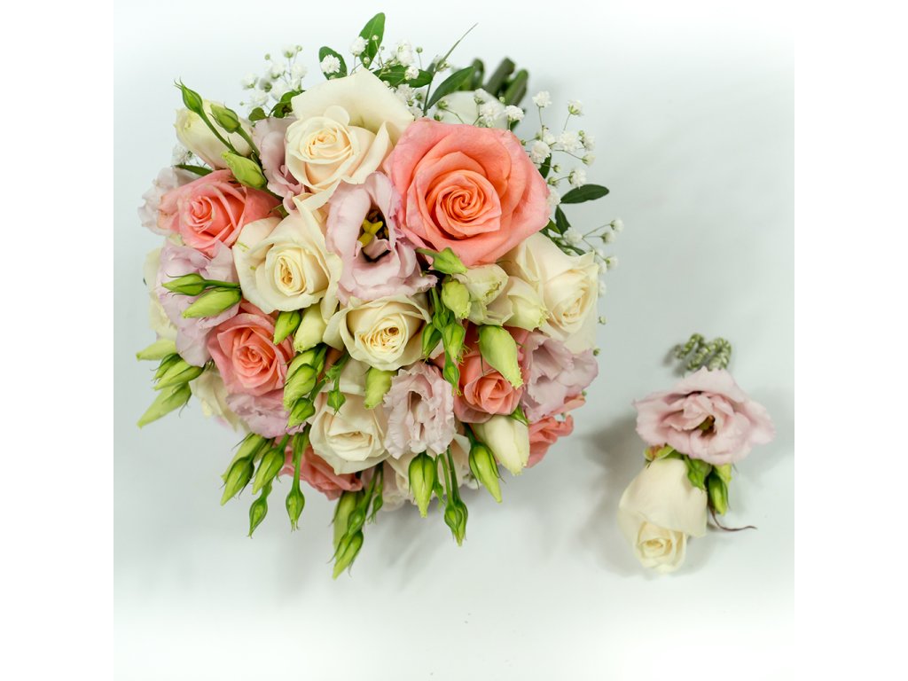 Okrúhla farebná svadobná kytica je zložená z bielych a lososových ruží , svetlo fialovej eustomy, gypsophily a doplnkov.
