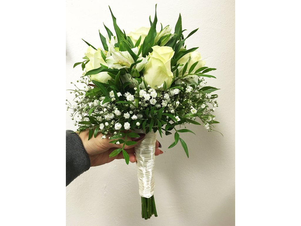 Svadobná kytica s alstromérií a ruží je zložená z bielych ruží, bielych alstromérií, gypsophily, pistácie a doplnkov.