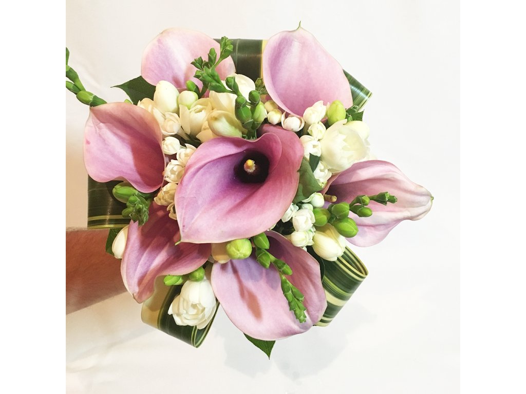 Svadobná kytica s rúžovými kalami je zložená z ružových kál, bielych frézií, zelene a doplnkov.