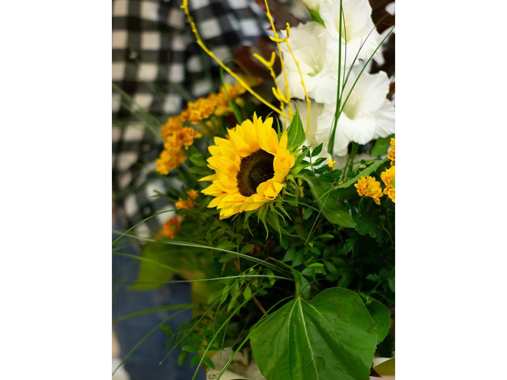 Kytica je vhodná pre dámy aj pánov je zložená z bielej gladioly, slnečníc, oranžovej santiny, qerkusu, zelene a doplnkov.