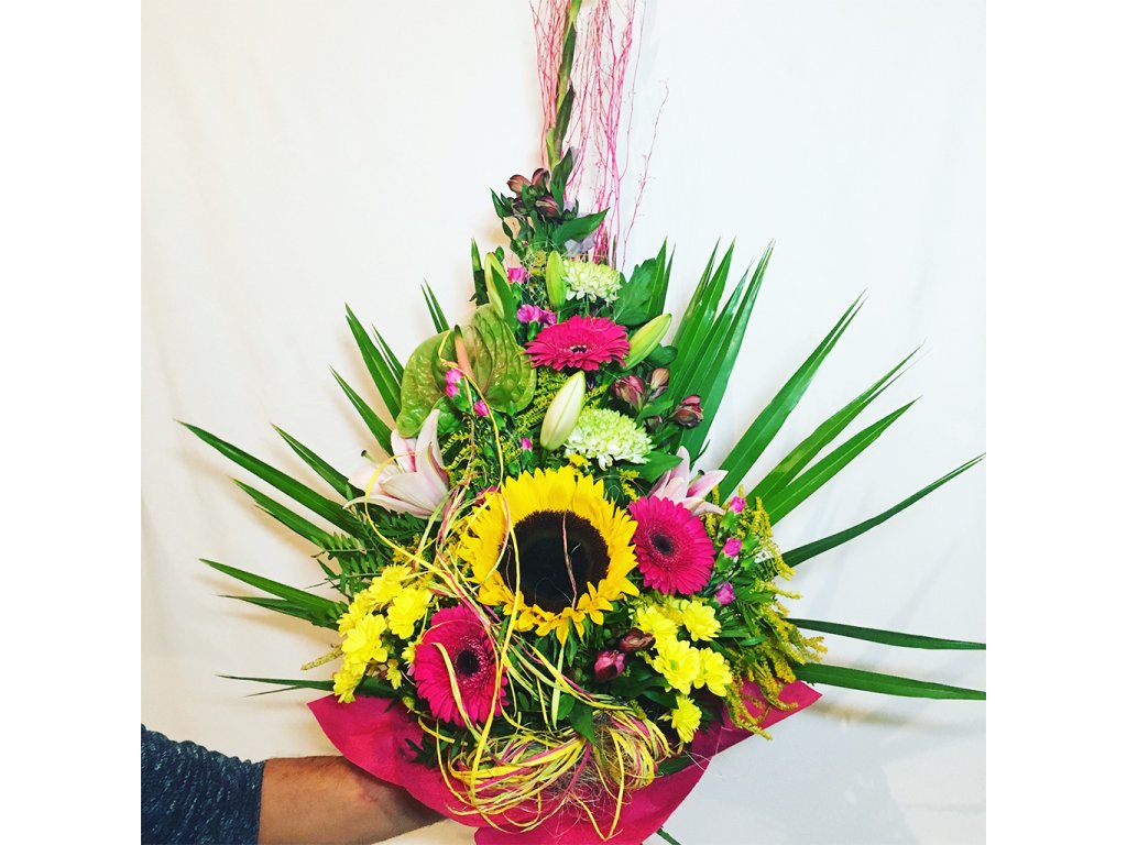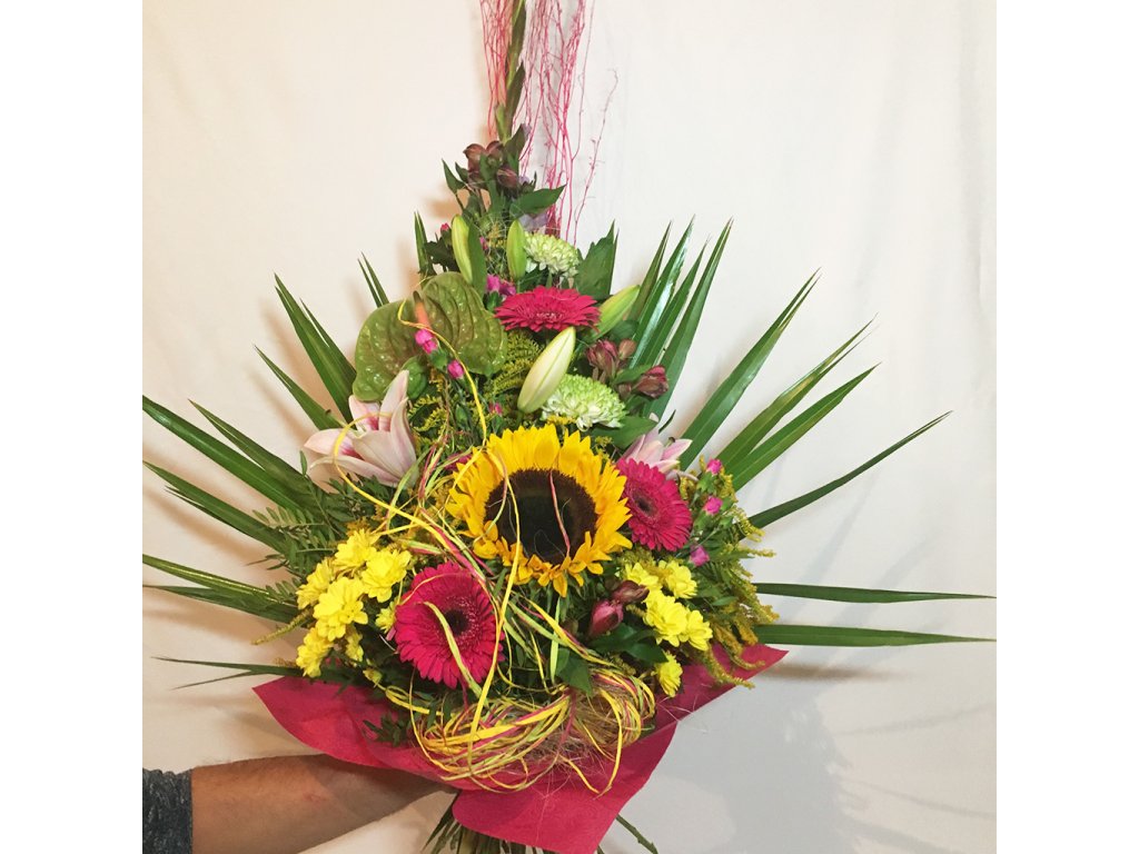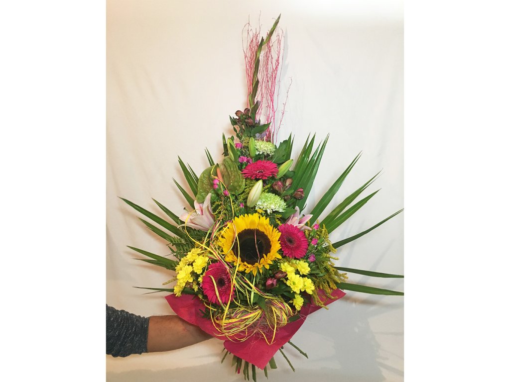 Letná kráska je viazaná z fialovej gladioly, fialových alstromérií, cyklamenových mini karafiátov, cyklamenových gerbier, zelených chryzantém, zelenej antúrie, ružovej kráľovskej ľálie, slnečnice, žltých chryzantém, solidaga, palmeta a doplnkov.