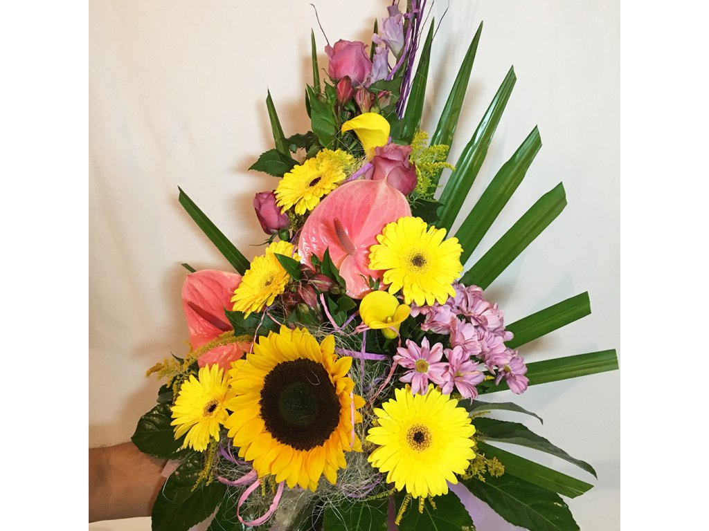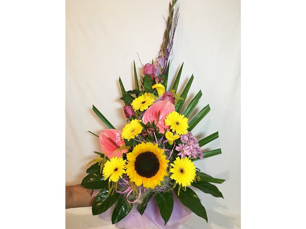 Kytica pyšná princezná je viazaná z fialového gladiolu, žltých gerbier, slnečnice, žltých kál, cyklamenových alstromérii, ružových antúrii, ružových ruží, ružovej chryzantémy, palmeta, žltého solidaga, aralie, pistacie a doplnkov.