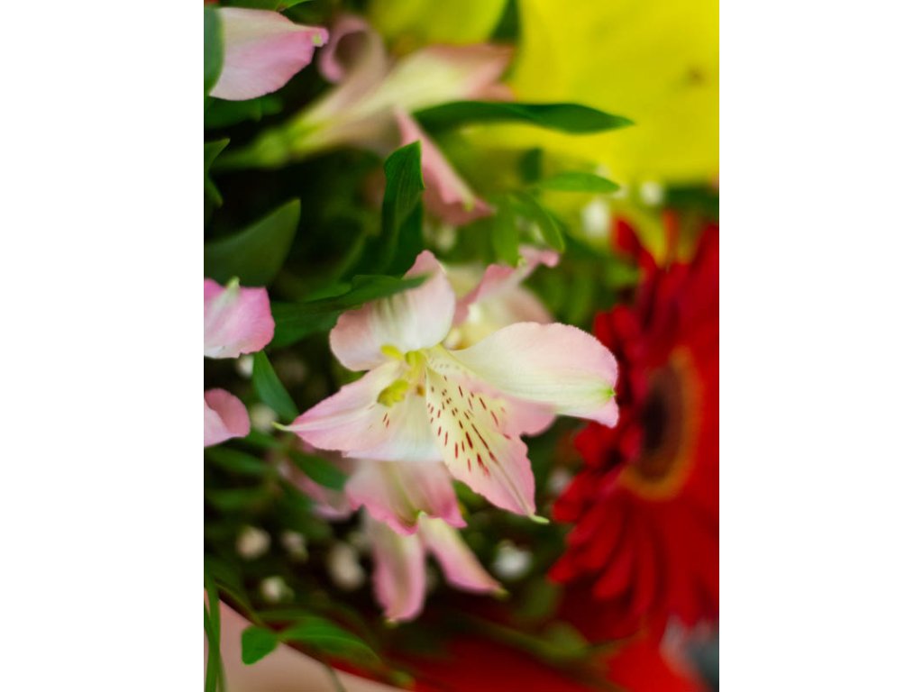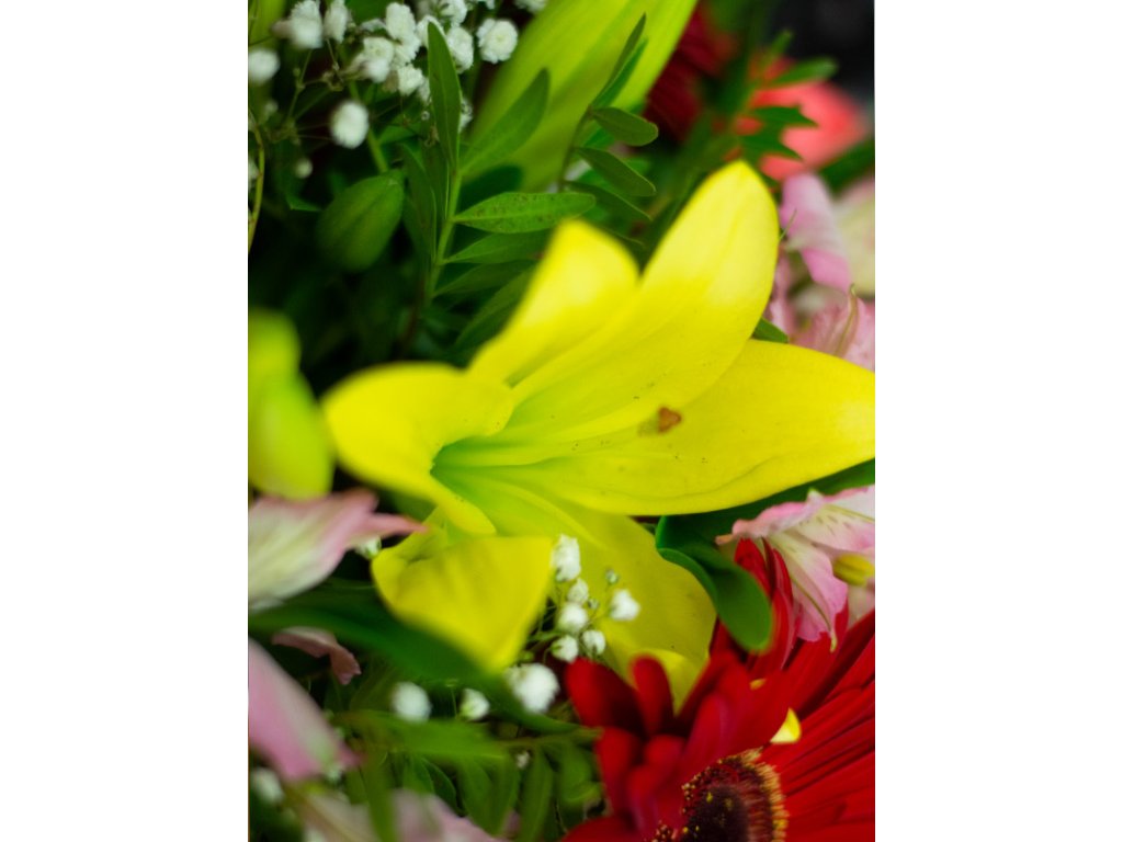 Kytica je zložená zo žltej ľalie, červených gerbier, ružových alstromérií, gypsophily, zelene a doplnkov.