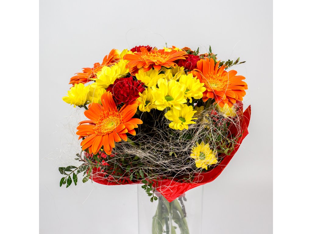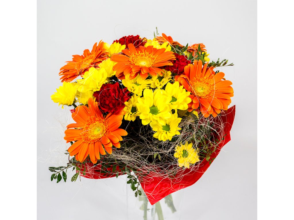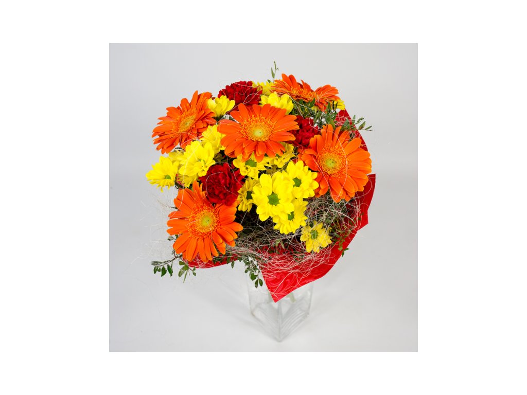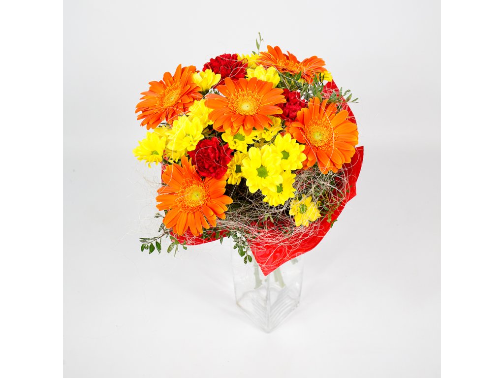 Veselá kytica s gerberami je viazaná z oranžových gerbier, žltých chryzantém, červených karafiátov, pistácie a doplnkov.