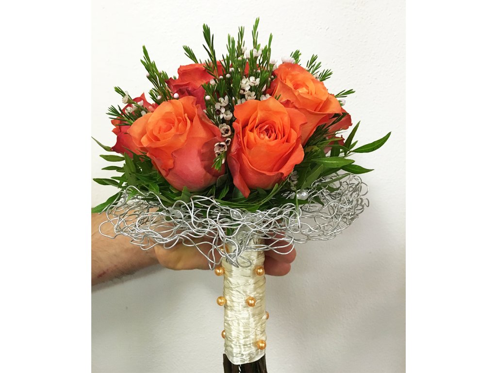 Oranžová svadobná kytica je zložená z oranžových ruží, wax flower, pistácie a doplnkov.